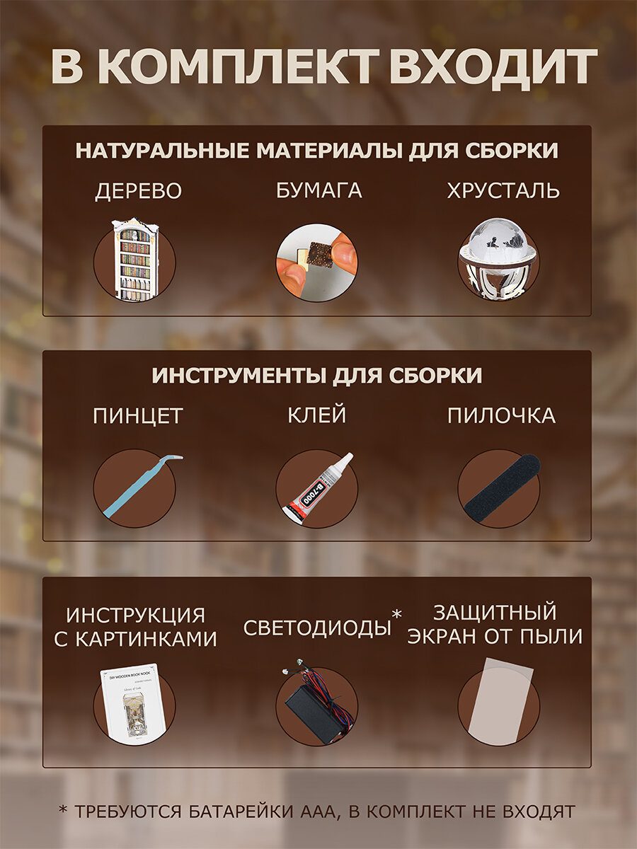 | Комплектация | Материалы для сборки / пинцет / клей / пилочка / инструкция / светодиоды |