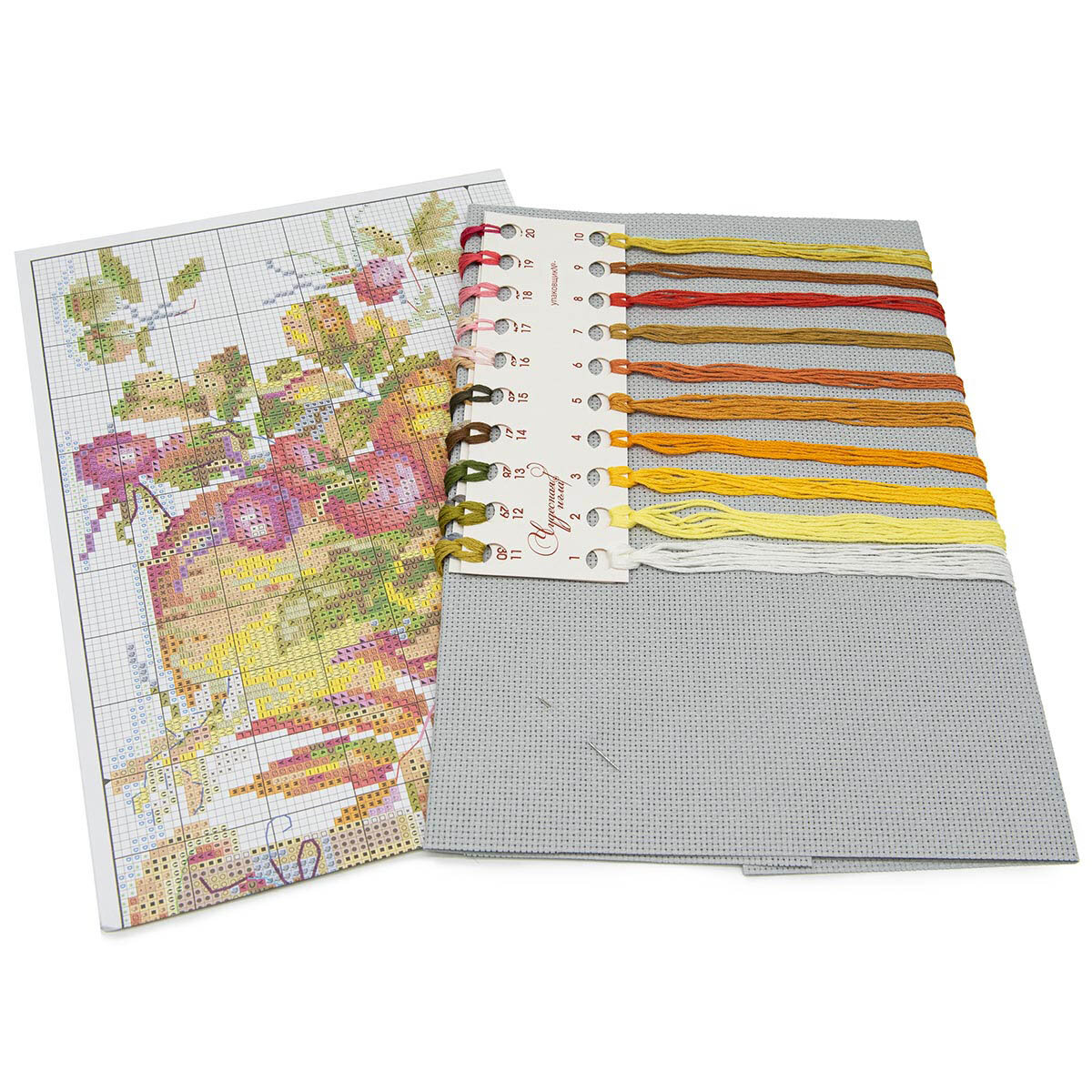 | Комплектация | канва Aida 14 светло-серого цвета, нитки мулине 100% хлопок Bestex (31 цвет), игла, схема, инструкция на русском языке |