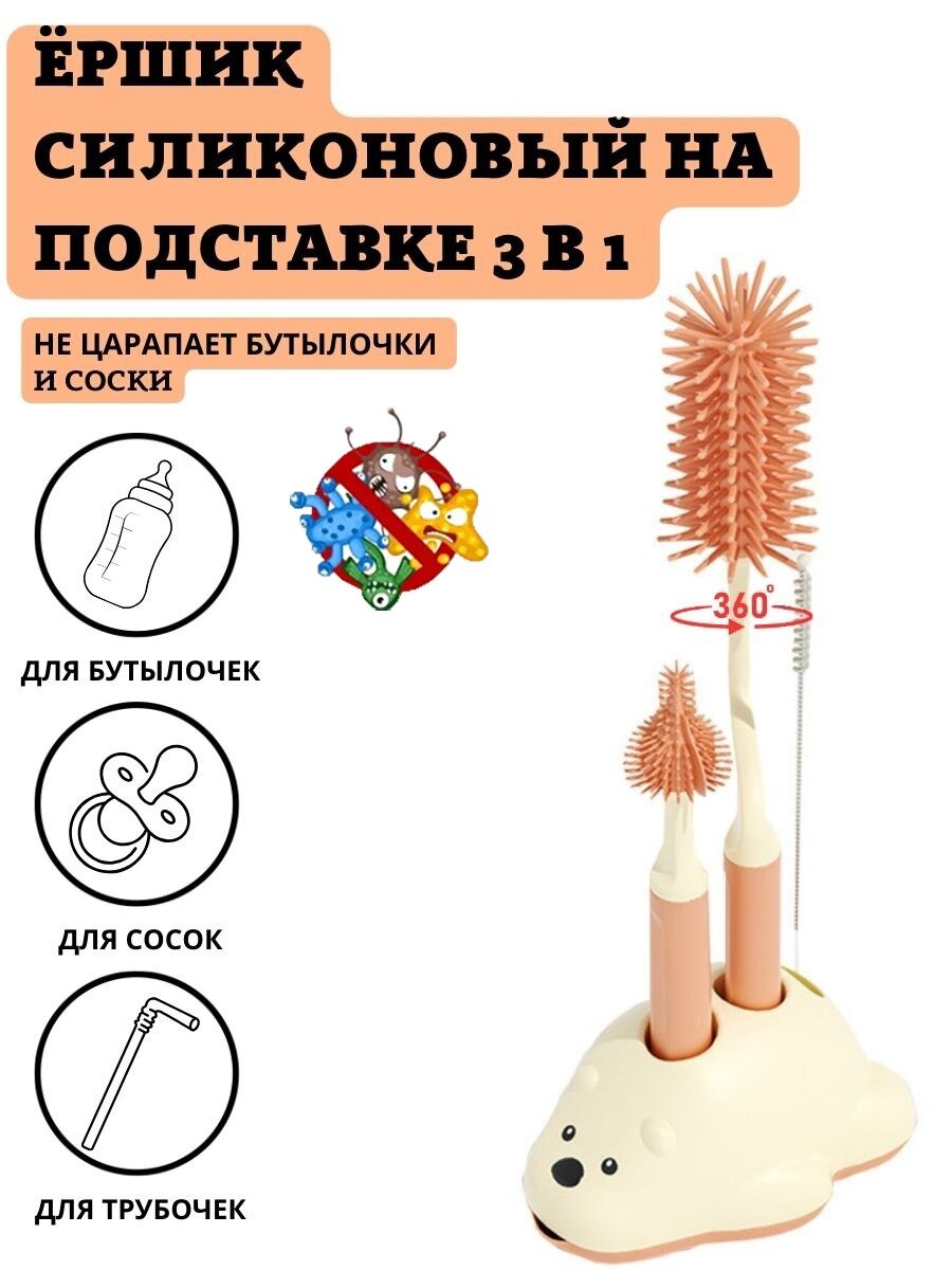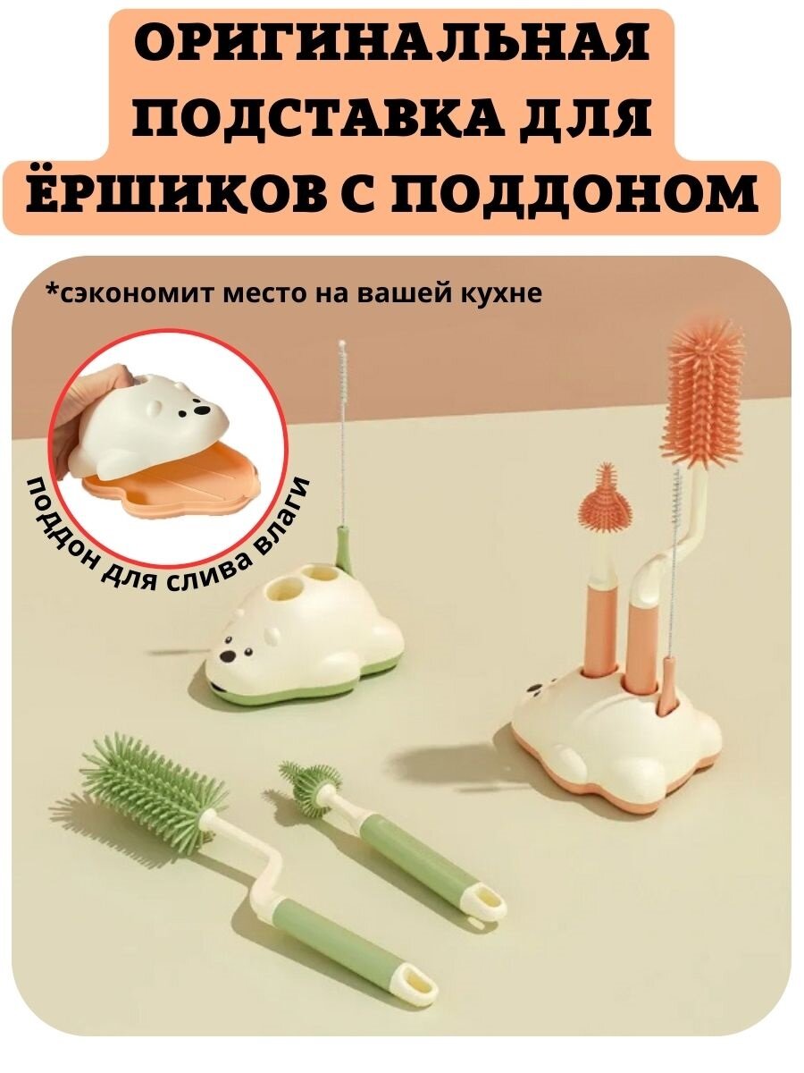Ершик силиконовый Floopsi для детских бутылочек и сосок 3шт., на подставке. Сушилка для ершиков интересное: