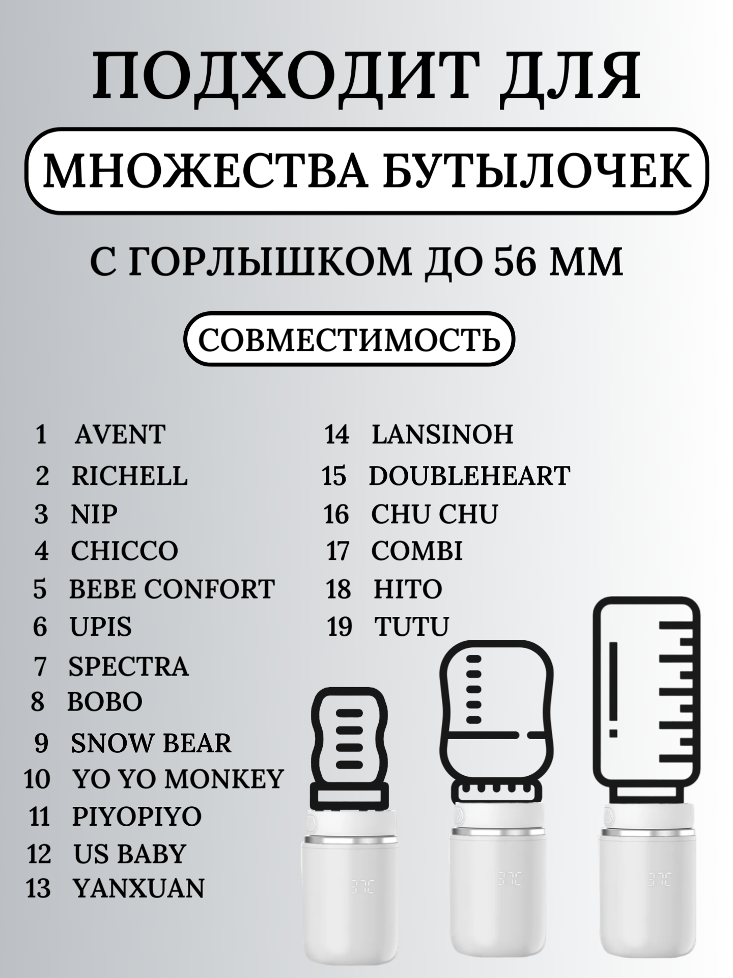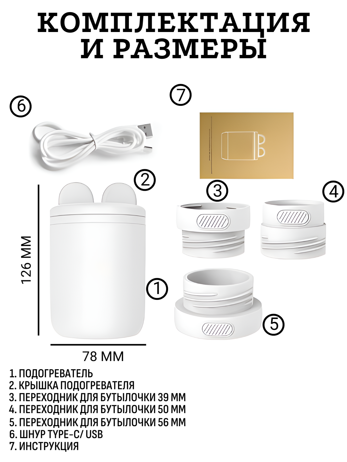 | Комплектация | Подогреватель; USB- провод; Пылезащитная крышка; Адаптер/переходник для бутылочек-3 шт; |
