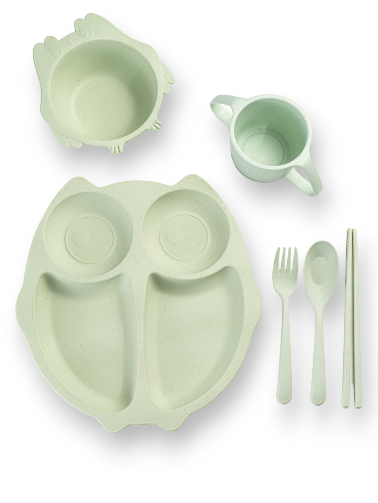 Купить Детская посуда Набор Совёнок детская тарелка, ложка, вилка, кружка, зеленый