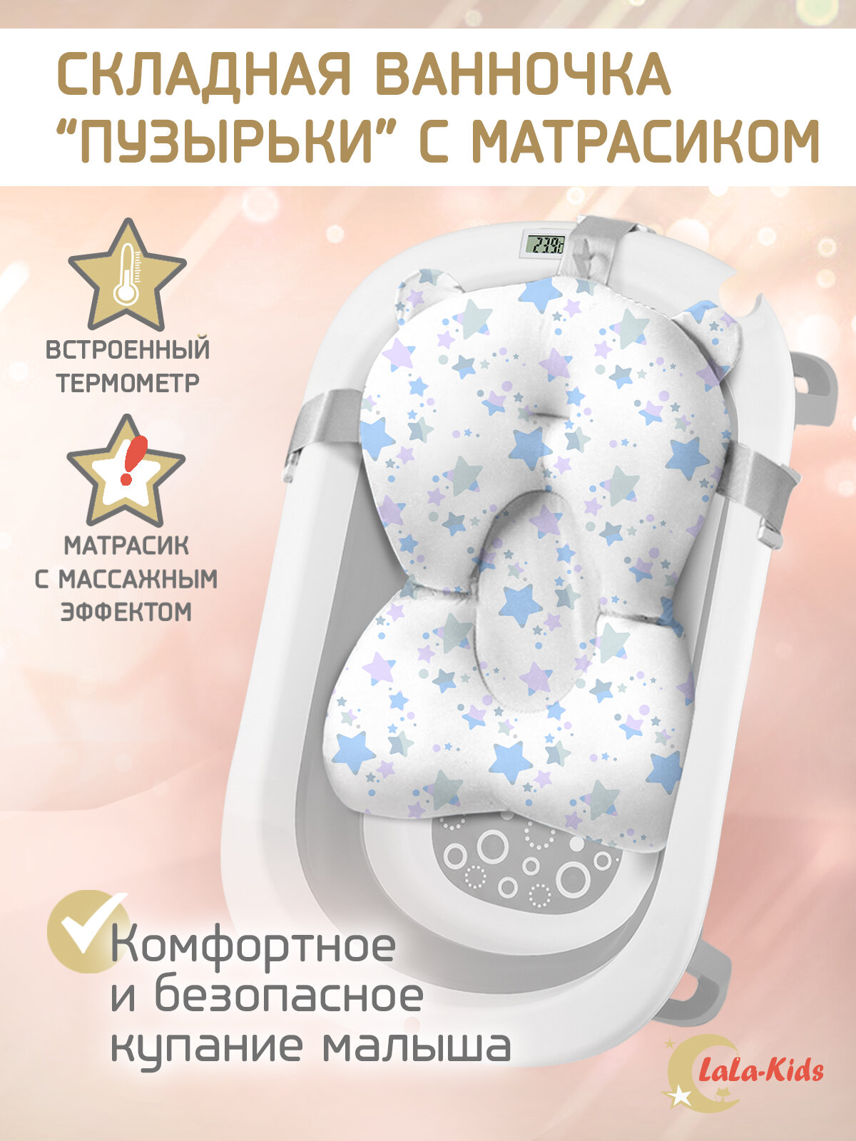 СохранитьВанночка для купания новорожденных складная с термометром и матрасом "Звездный голубой" LaLa-Kids серая интересное: