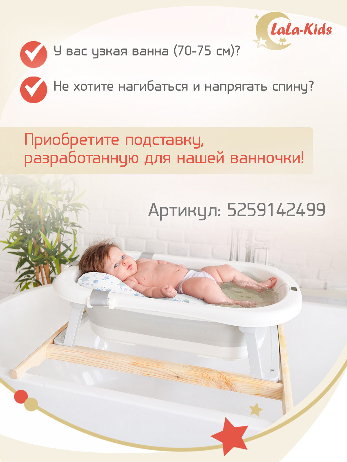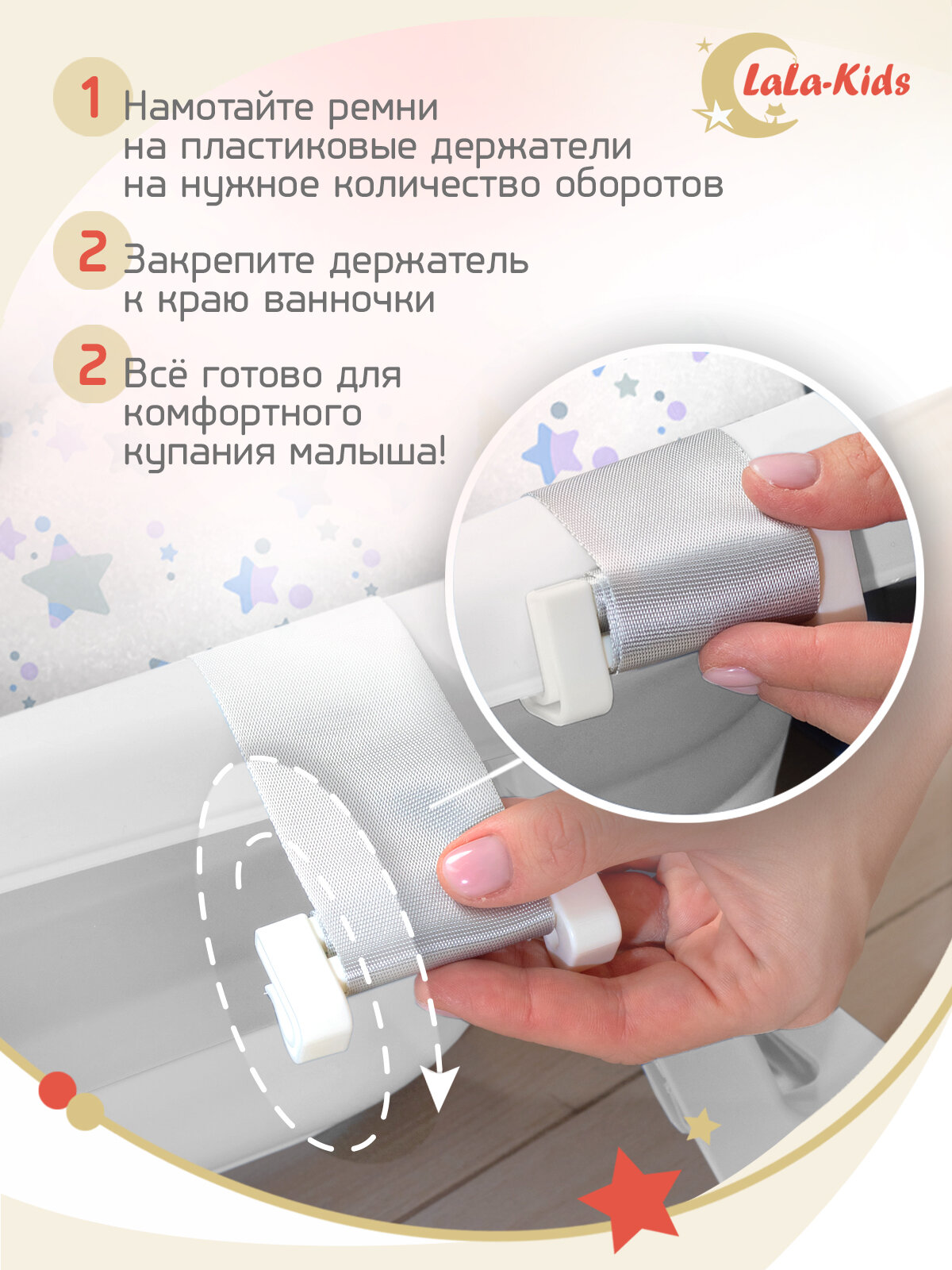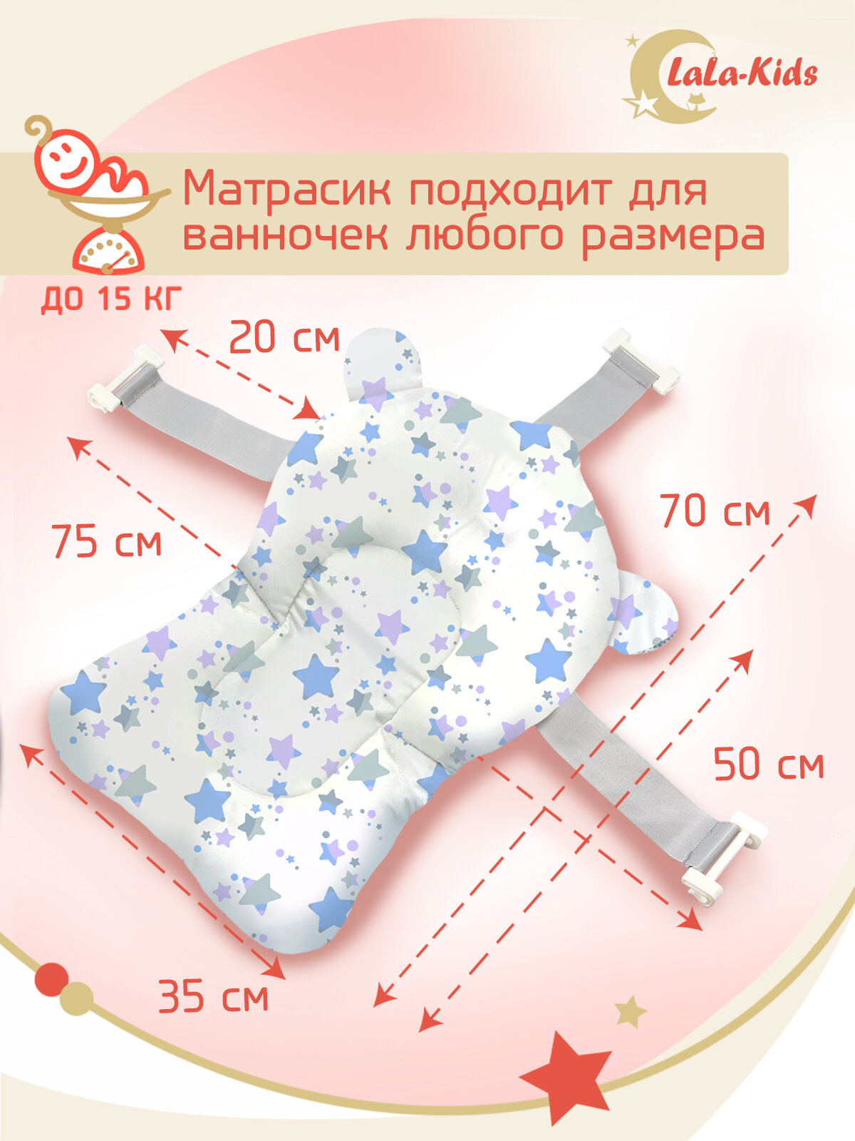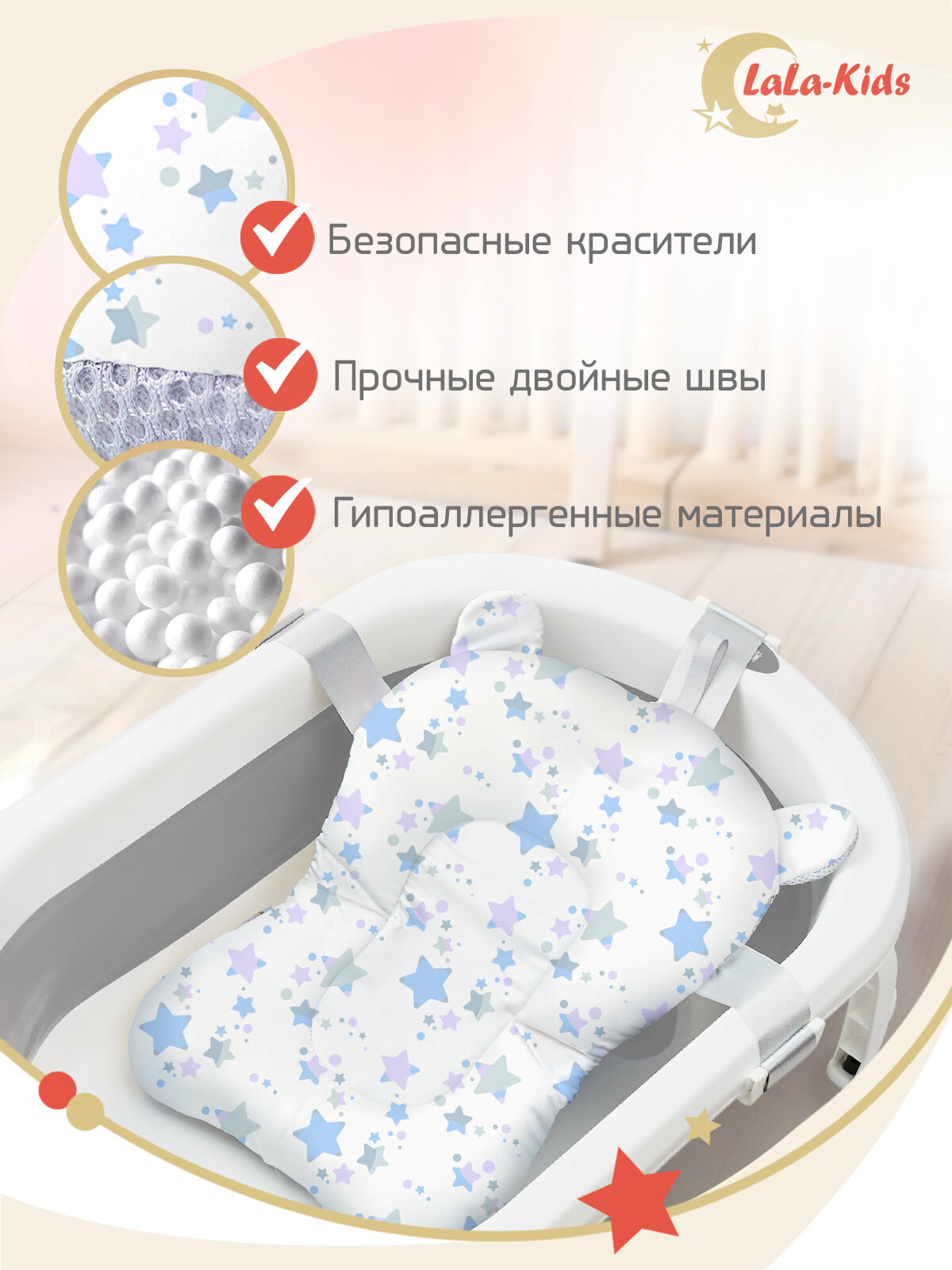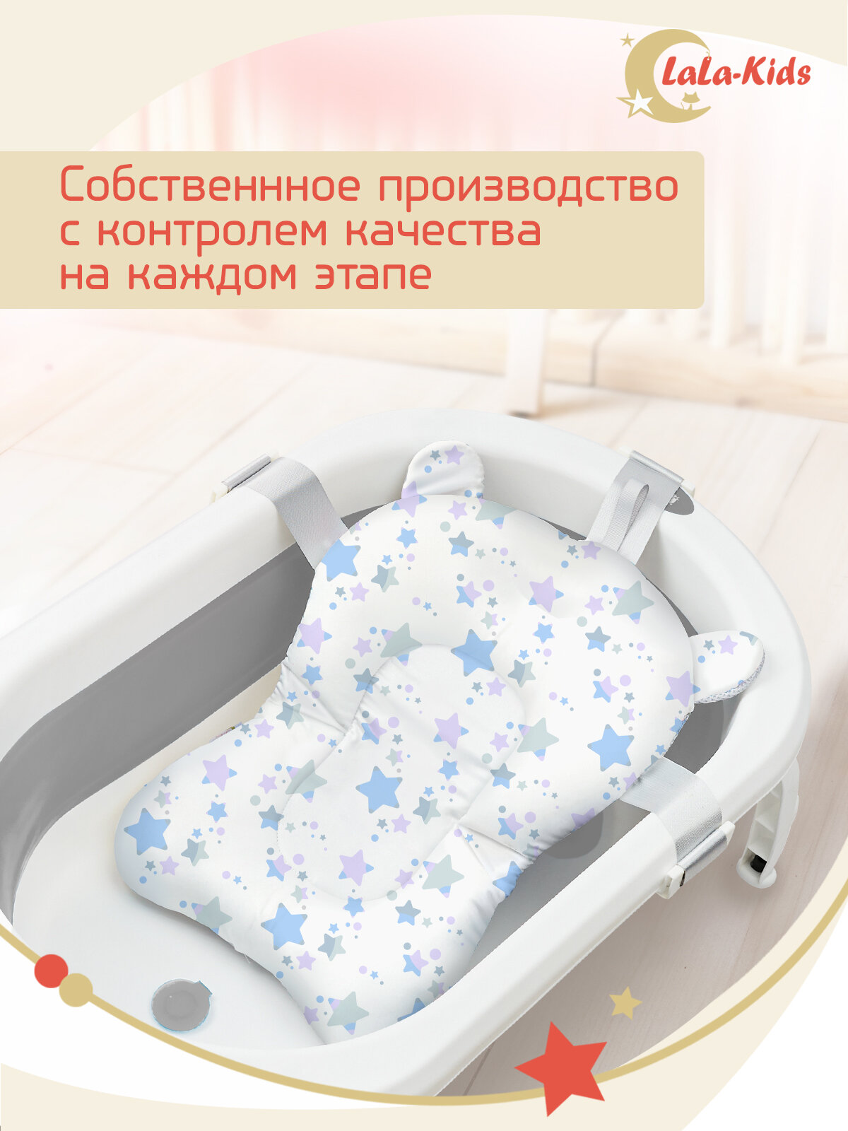 Ванночка складная с термометром для купания новорожденных LaLa-Kids, матрасик-горка для купания Звезды серые