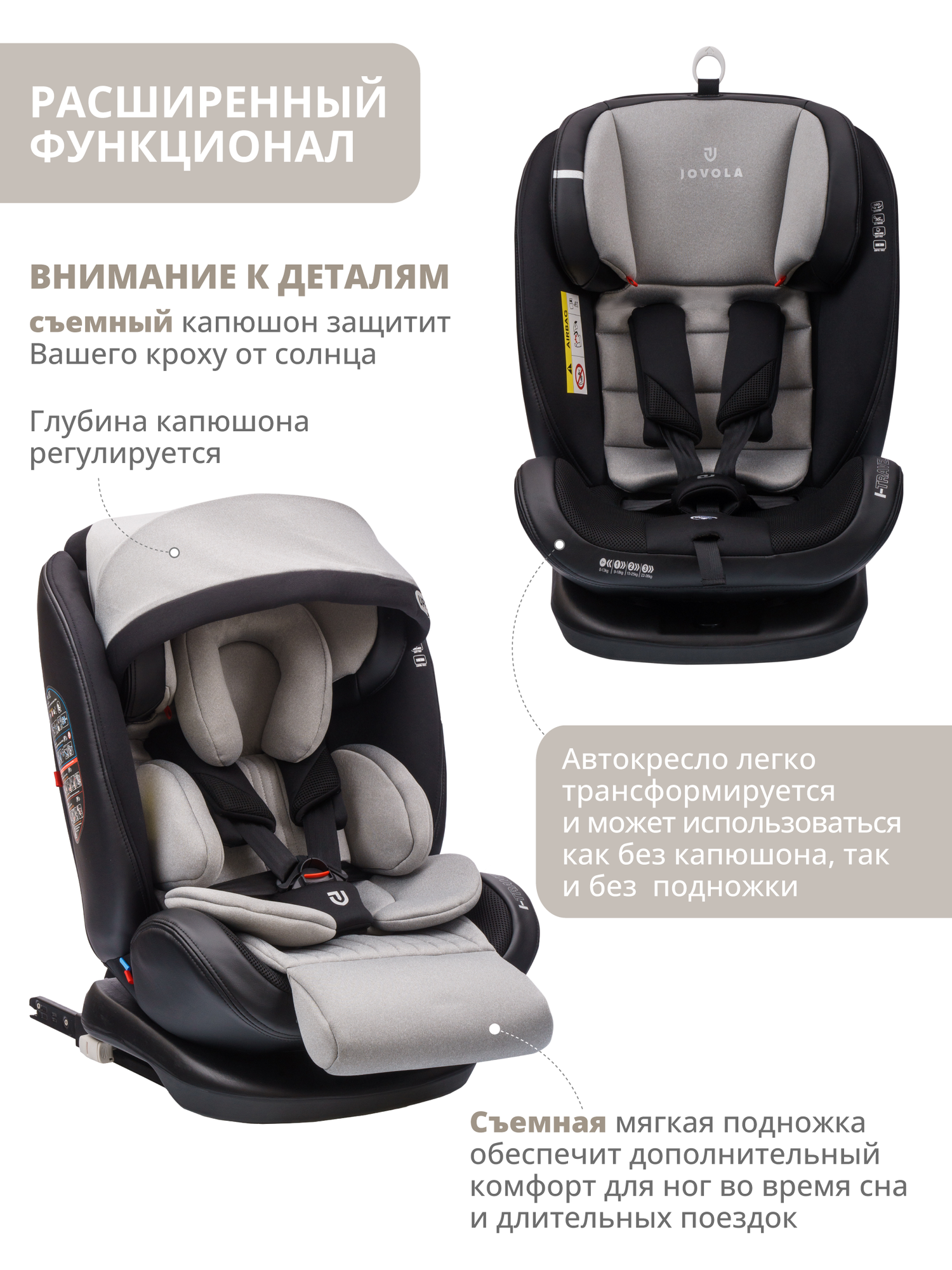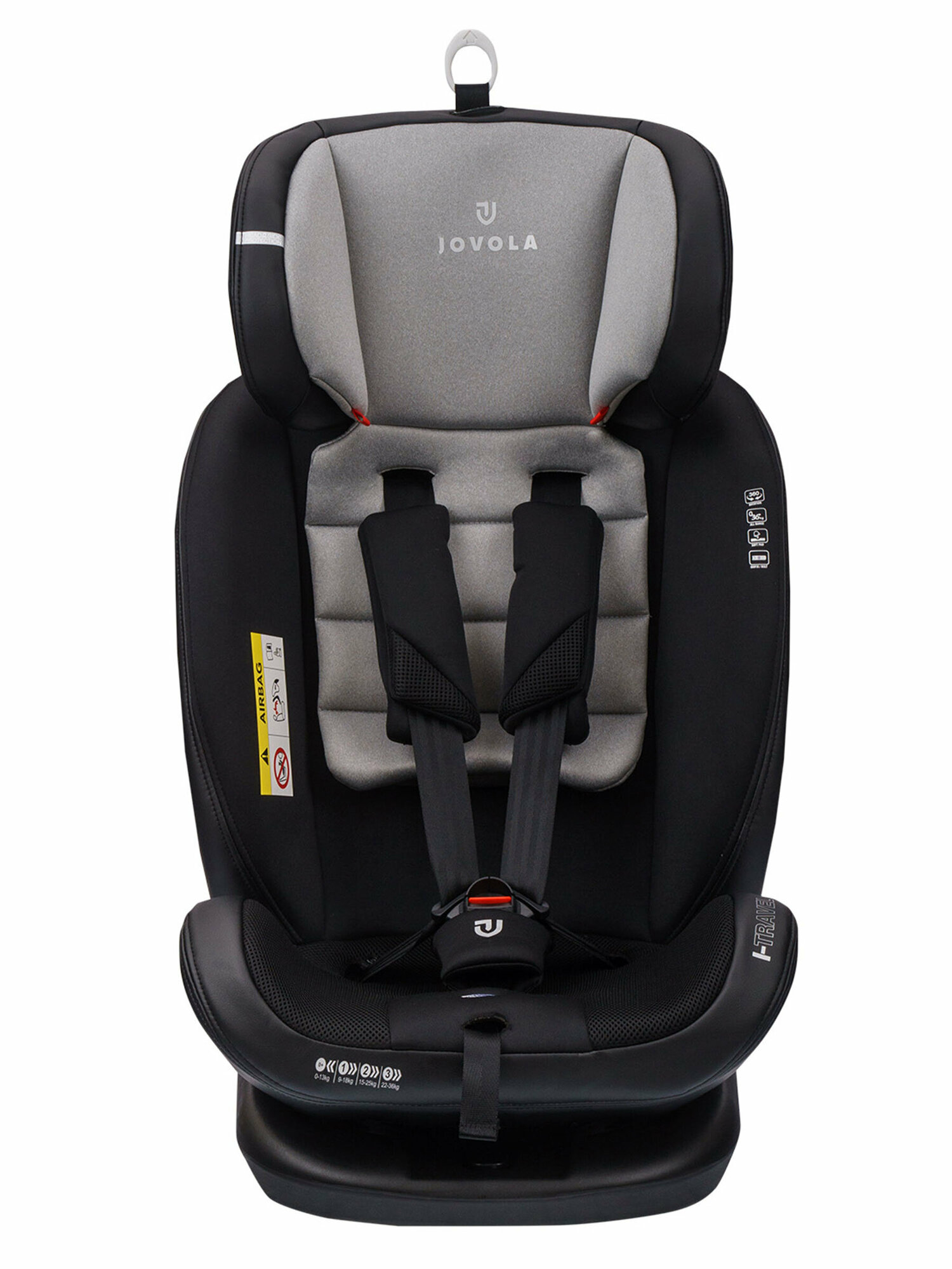 Детское автокресло Jovola I-Travel Isofix растущее, группа 0/1/2/3 (до 36 кг), черный, св. серый