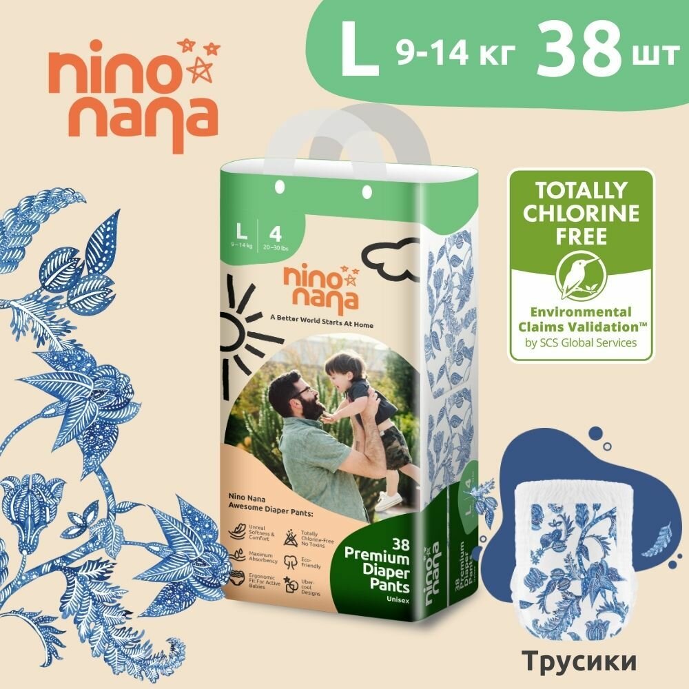 Подгузники-трусики детские Nino Nana L (9-14 кг), 4 размер. 38 штуки, расцветка Бали (Q-форма)