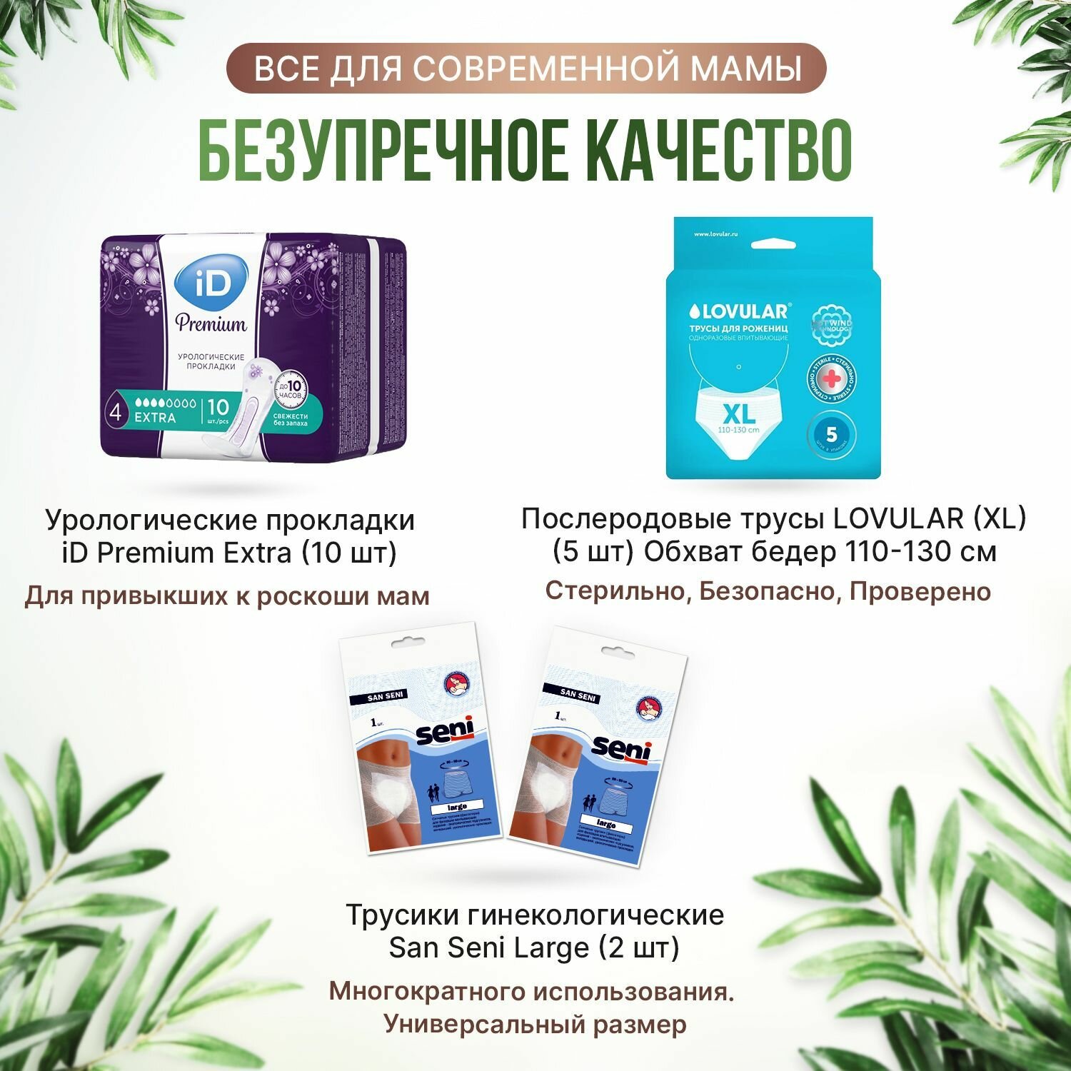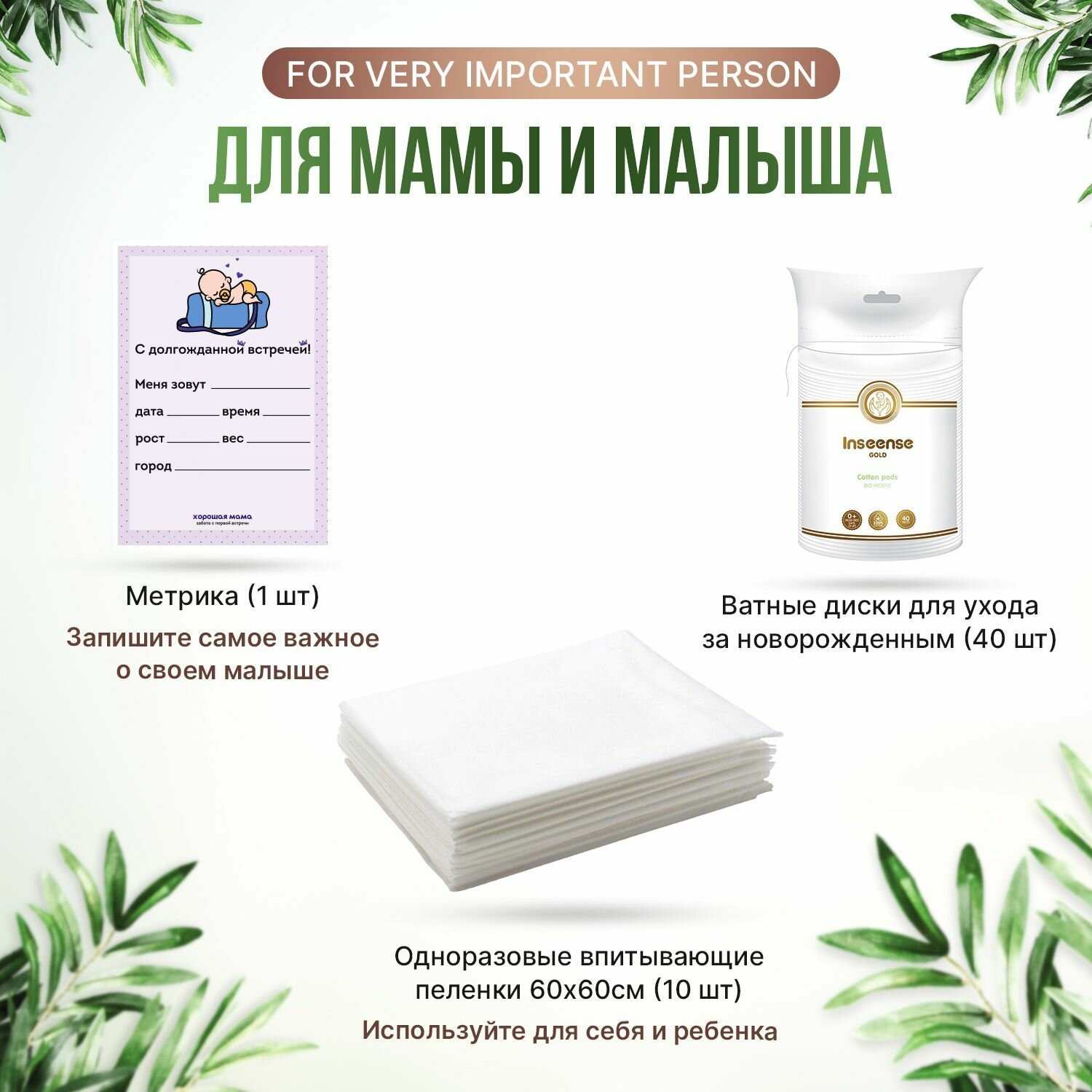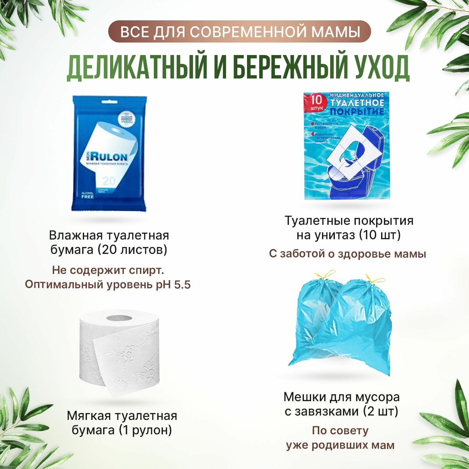 | Состав набора | ватные диски, влажная туалетная бумага, влажные салфетки, крем для сосков, мыло, одноразовые покрытия на сиденье унитаза, пеленки для мамы, пеленки для новорожденного, подгузники, прокладки для груди, прокладки послеродовые, трусики |