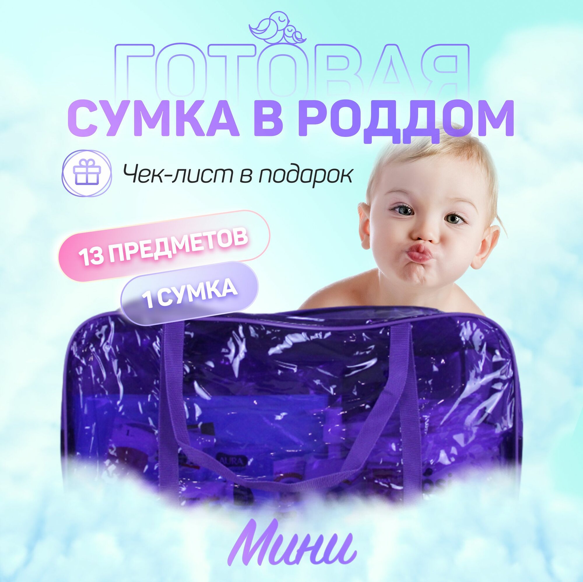 Купить Сумка в роддом готовая для мамы и малыша с наполнением, 13 предметов + 1 фиолетовая сумка , комплектация "Мини"