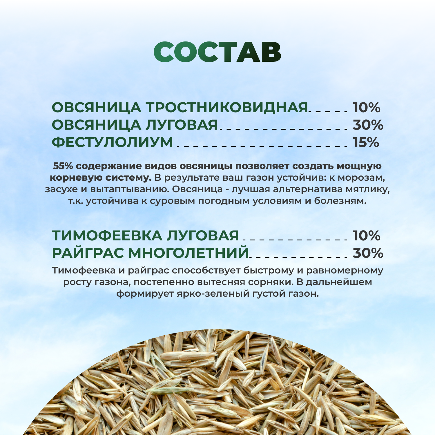 | Состав смеси | Овсяница тростниковидная 10%; Тимофеевка луговая 30%; Райграс многолетний 15%; Фестулолиум 15%; Овсяница луговая 30% |