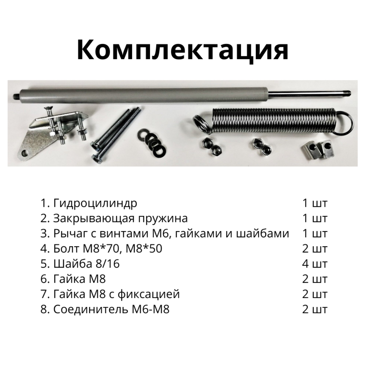| Дополнительная информация | в комплекте: гидроцилиндр 300 - 1 шт; закрывающая пружина - 1 шт; рычаг с винтами М6, гайками, шайбами - 1 шт; болт М8х80 – 2 шт; шайба 8/16 – 4 шт; гайка М8 – 2 шт; гайка М8 с фиксатором - 2 шт; наконечник М6 –М8 - 2 шт; особенности: ход штока зависит от нагрузки: под нагрузкой 100 кг ход штока меньше на 15 мм., чем при нагрузке 30 кг; обслуживание: ежегодно протирайте и смазывайте шток литолом либо солидолом |