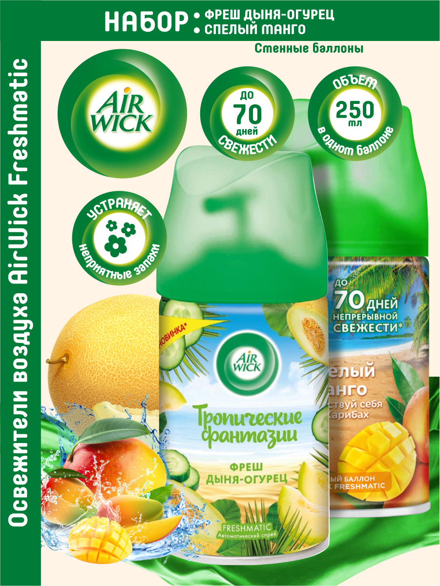 Купить Набор сменных баллонов AIRWICK Фреш дыня-огурец + Тропические фантазии Спелый манго по 250 мл.