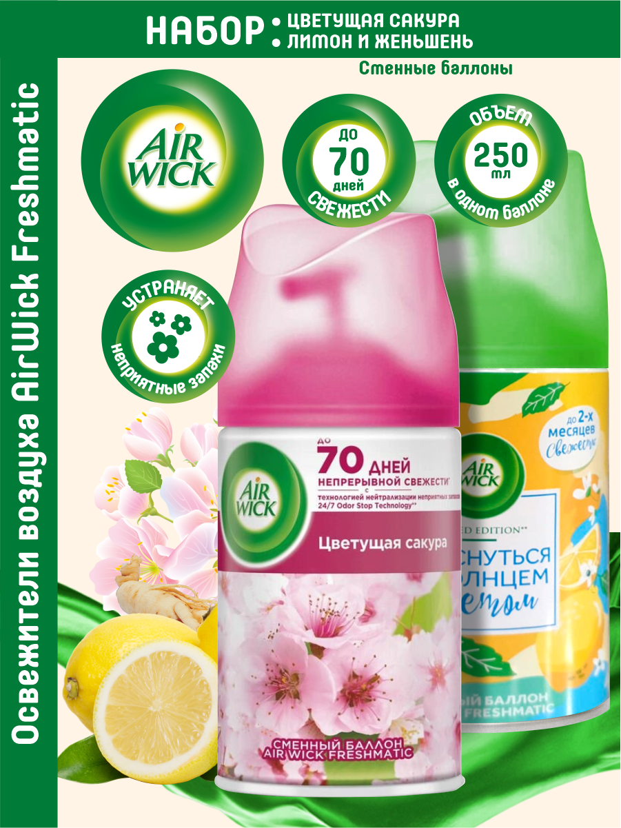 Купить Набор сменных баллонов AIRWICK Freshmatic Цветущая сакура + Женьшень и лимон по 250 мл.