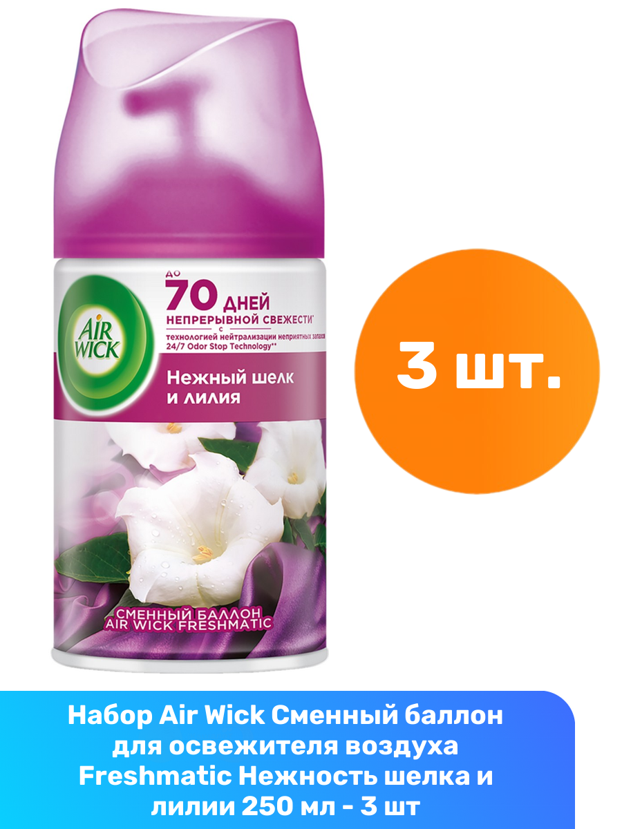 Комплект 3 шт, Сменный баллон 250 мл, AIRWICK "Нежность шелка и лилии", для автоматических освежителей, универсальный