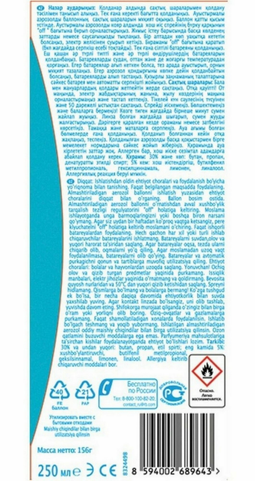 | Не содержит | нефтепродукты / парабены / спирт / фосфаты / хладоны / хлор |