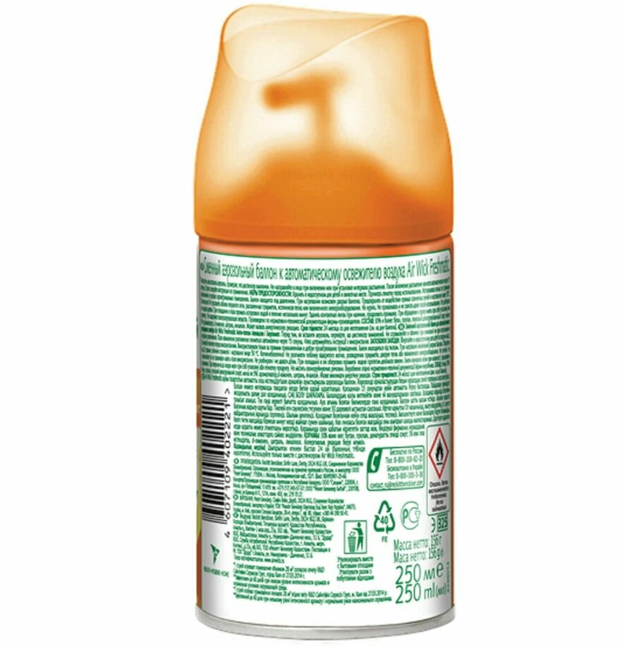 | Дополнительная информация | баллон для автоматического освежителя воздуха Air Wick Freshmatic, коллекция "Life Scents"; перед тем, как вставить аэрозоль, проверьте, что диспенсер выключен; не направляйте в лицо при включении или при установке интервала распыления; после включения распыление начнется автоматически через 15 сек |
