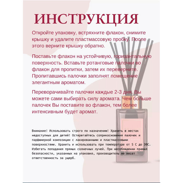 | Подробная комплектация | Ароматический диффузор - флакон 85 мл; ротанговые палочки - 10 шт. |