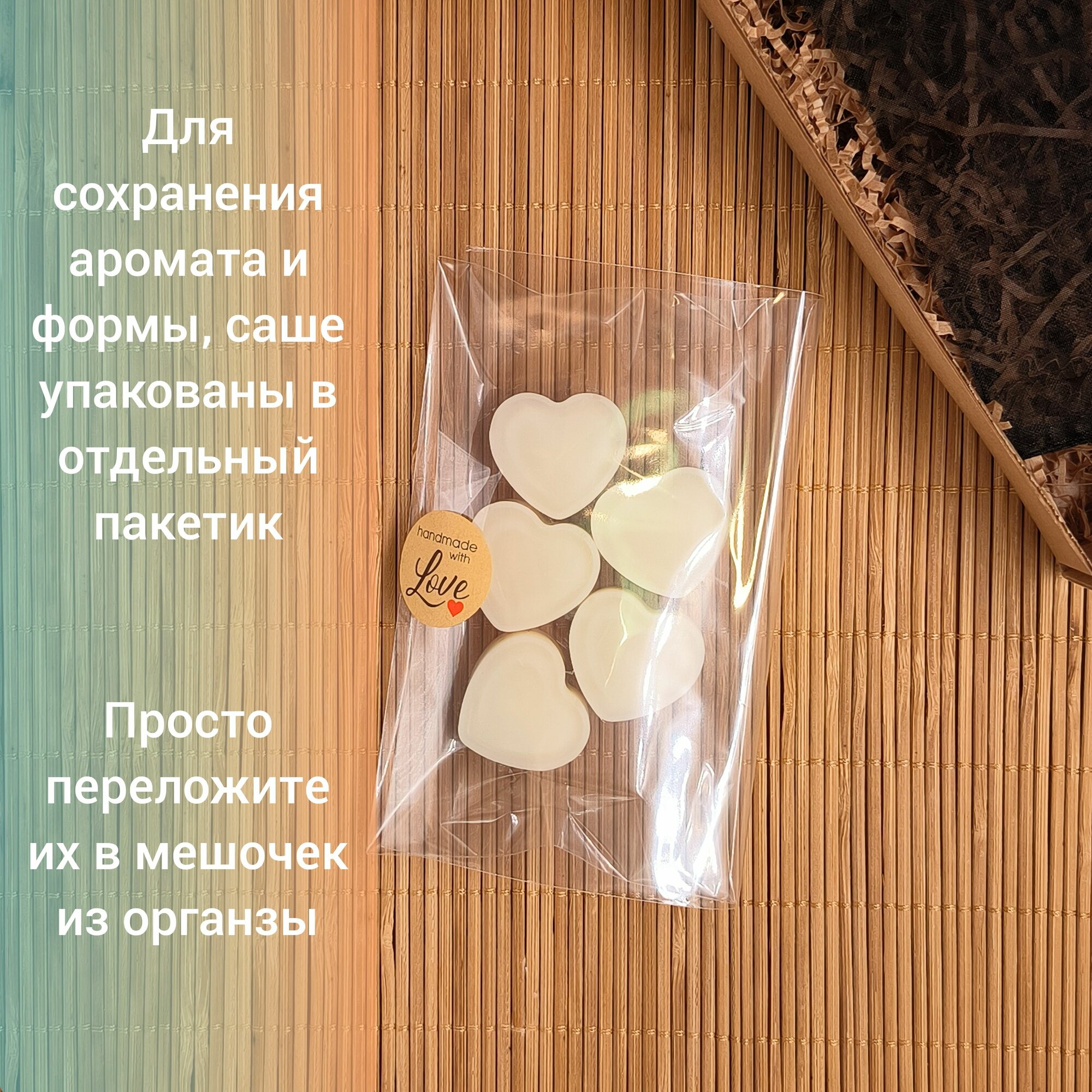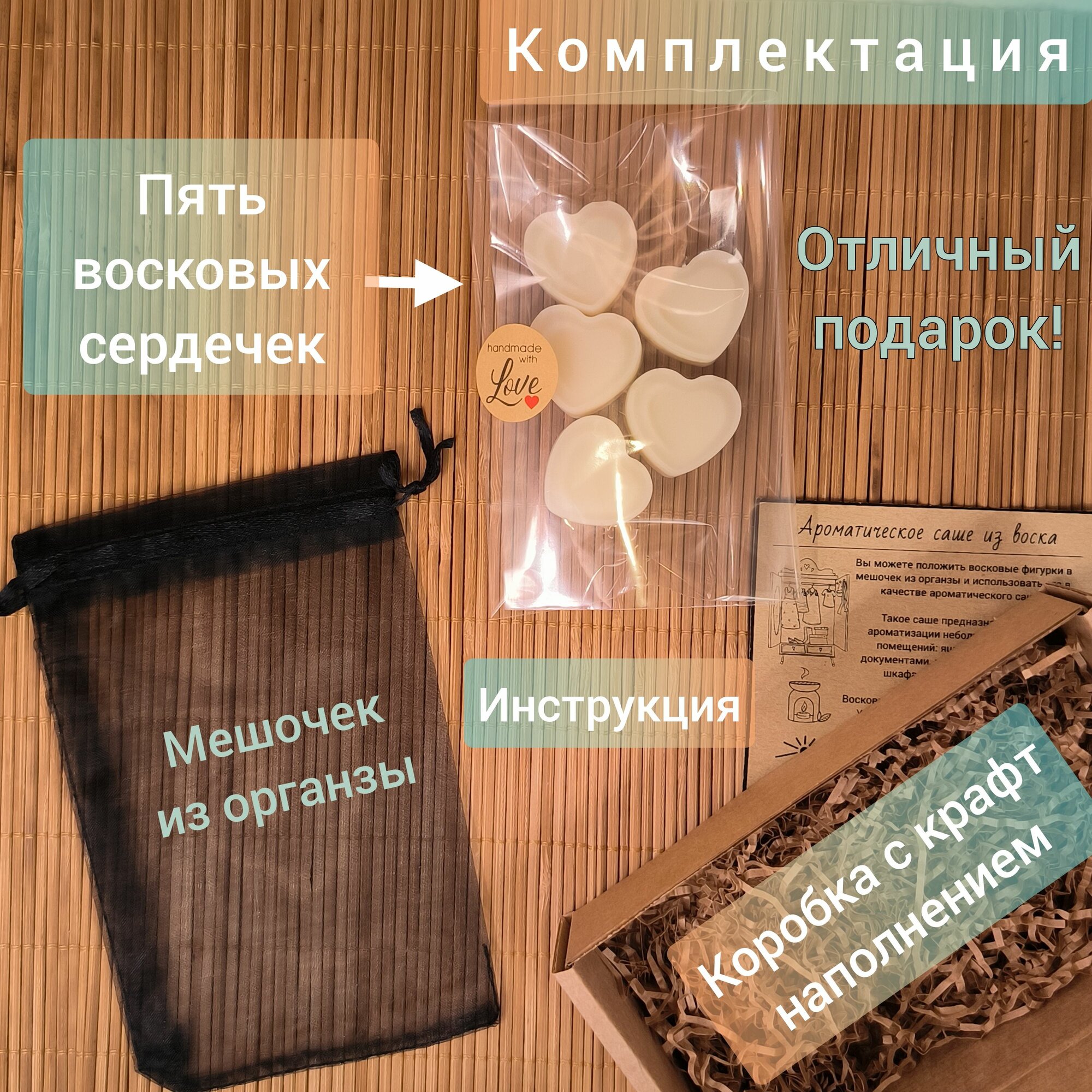 | Подробная комплектация | Пять сердечек из оливкового воска, мешочек из органзы, инструкция, крафт наполнитель, коробка |