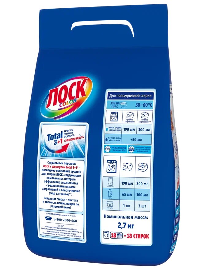 | Способ применения | Насыпьте необходимое количество порошка в соответствующее отделение стиральной машины перед началом стирки. Подробная информация о дозировке указана на упаковке. Следуйте рекомендациям, указанным на ярлыках изделий. Изделия из тканей с неустойчивыми красителями стирайте отдельно. При ручной стирке перед загрузкой белья полностью растворите порошок в воде, после стирки несколько раз прополощите изделие в тёплой, а затем в холодной воде до исчезновения пены. |