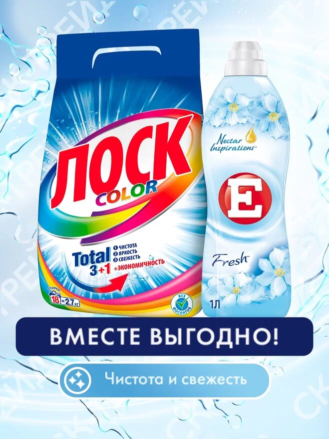 Набор для стирки стиральный порошок Лоск Колор 2,7кг автомат+ Кондиционер ополаскиватель "Е Свежий" 1л, бутылка интересное: