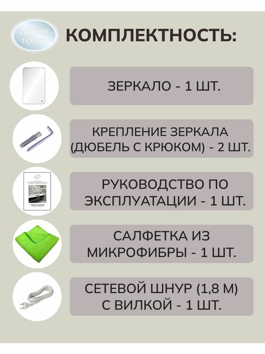 | Комплектация | зеркало, комплект крепежей, шнур с вилкой 1,5 м, салфетка из микрофибры, инструкция |