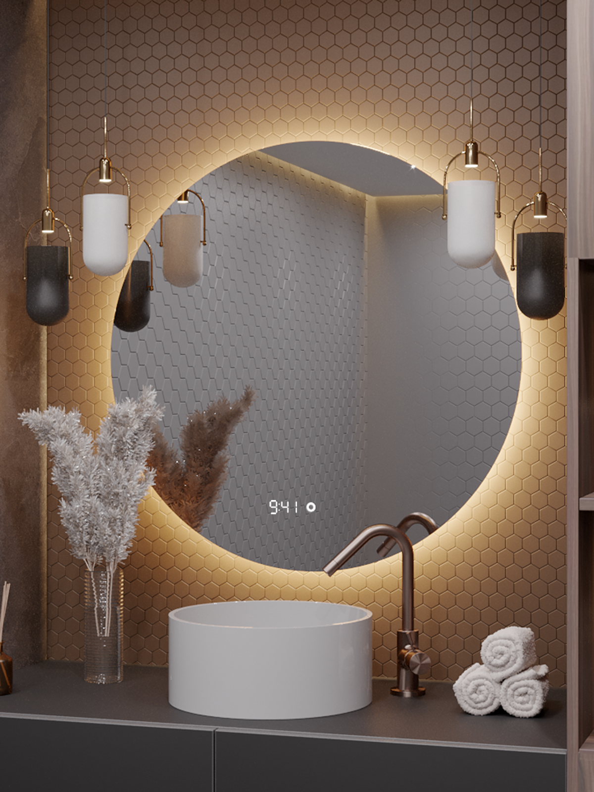 | Особенности | без рамы, подсветка, регулировка яркости подсветки, с часами, сенсорный выключатель подсветки |