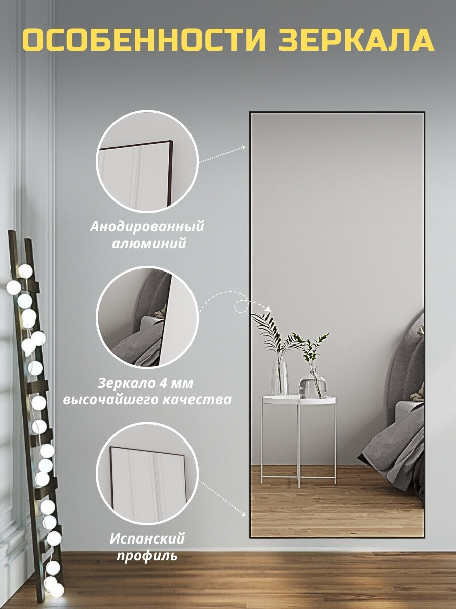 Настенное зеркало в полный рост 60х170 см черный в алюминиевой раме на пол или на стену в прихожую, зеркало большое напольное