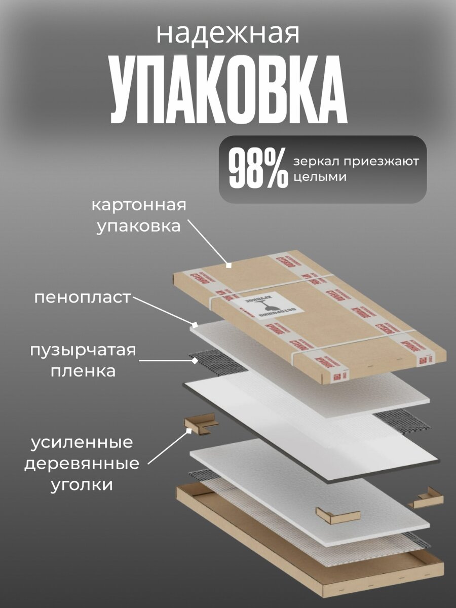 | Комплектация | Зеркало в алюминиевой раме, противоосколочная пленка, крепление |