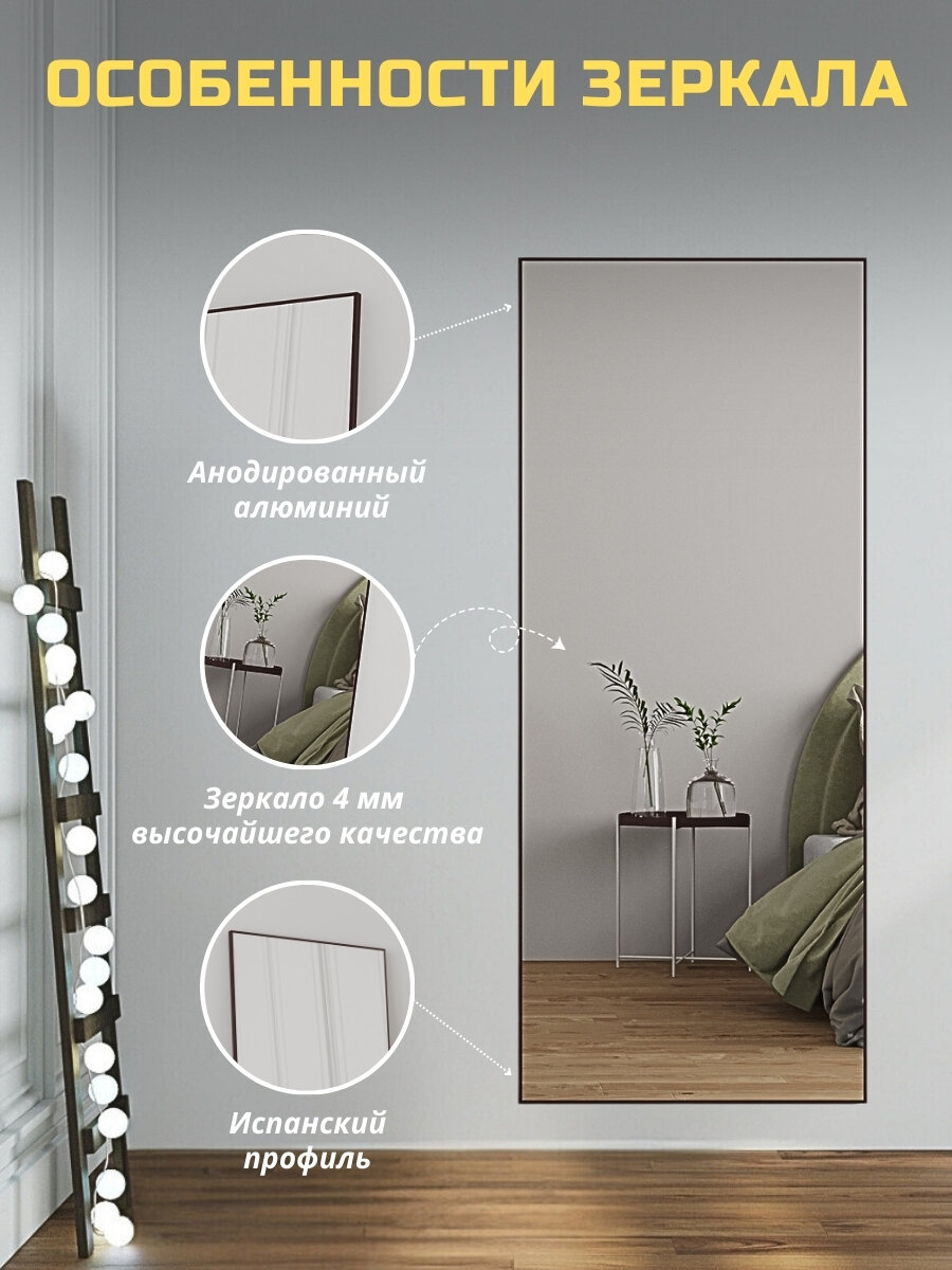 Зеркало напольное в полный рост 50х170см цвет темно-коричневый, зеркало в алюминиевой раме на пол или на стену, большое зеркало