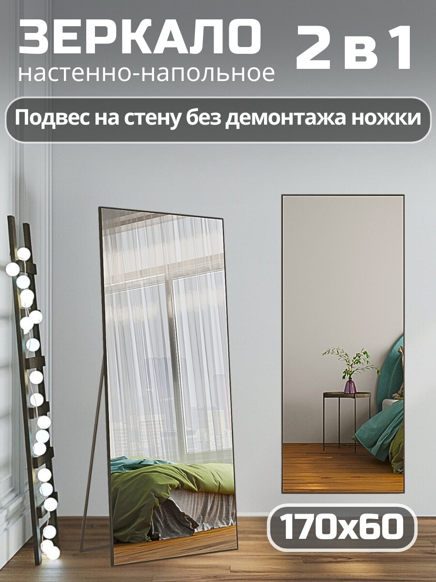 Настенное зеркало в полный рост 60х170 см черный в алюминиевой раме на пол или на стену в прихожую, зеркало большое напольное