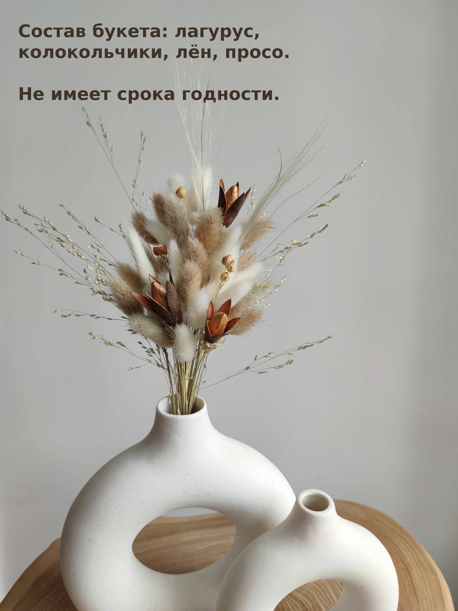 | Подробная комплектация | лагурус, колокольчики, лён, просо |