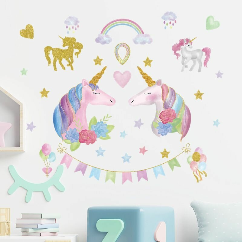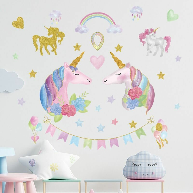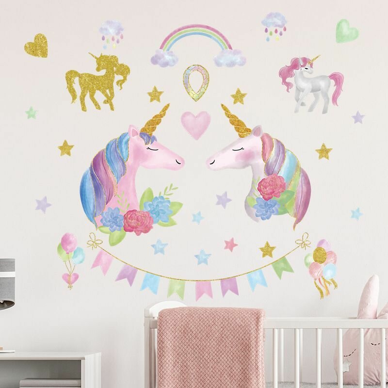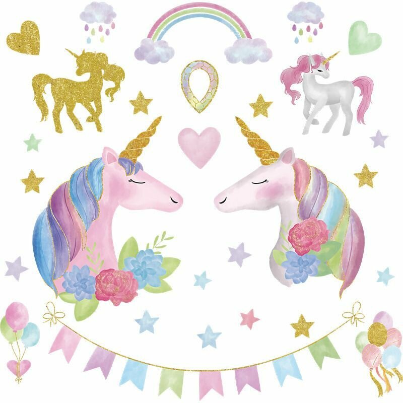 Купить Наклейка на стену для интерьера для детей Единороги с флажками и цветами
