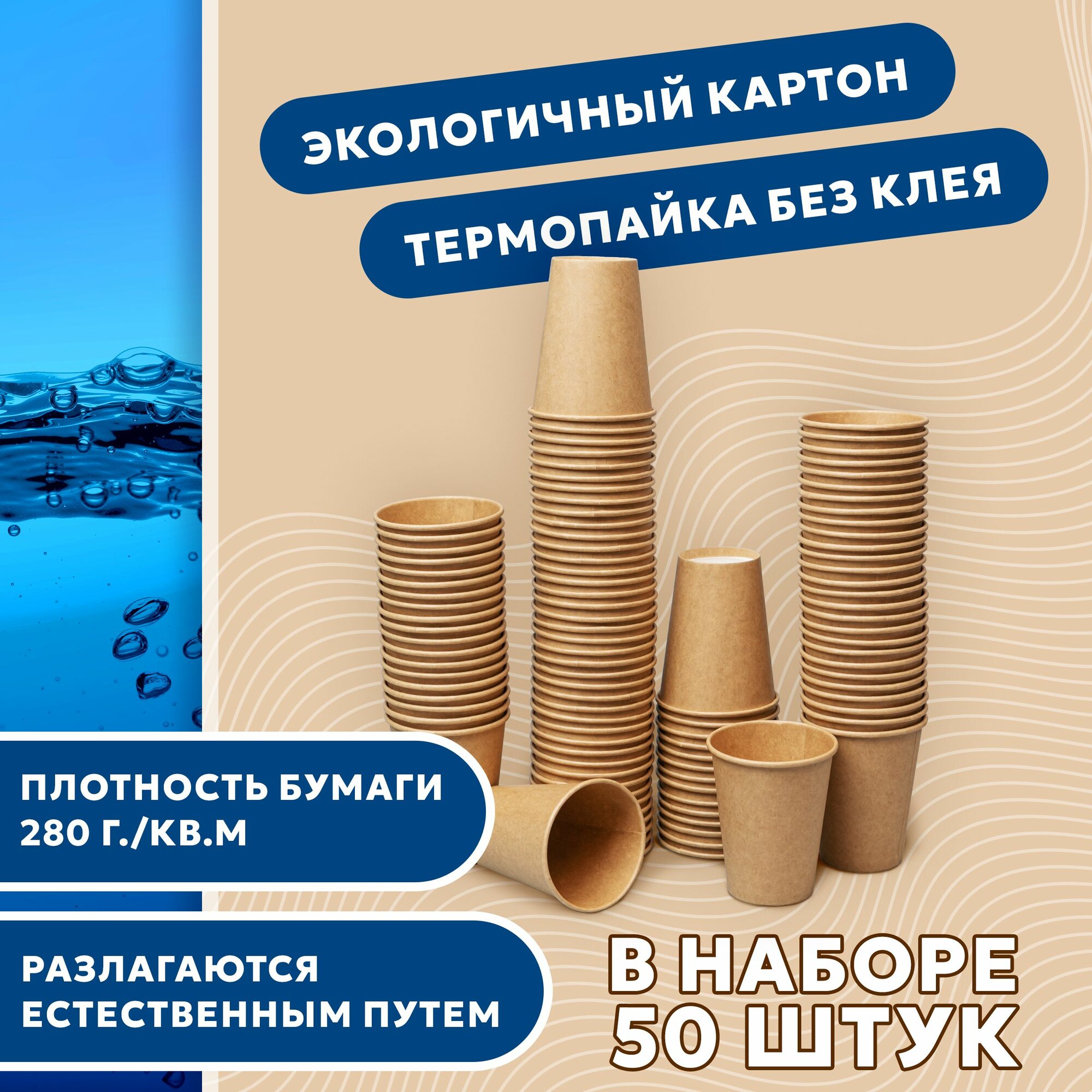 Набор одноразовых стаканов гриникс, объем 250 мл 50 шт. крафт, бумажные, однослойные, для кофе, чая, холодных и горячих напитков
