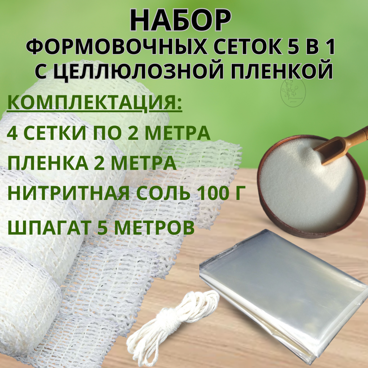 | Комплектация | сетка 80мм-2м,125мм-2м,150мм-2м,220мм -2 м.пленка целлюлозная 2м, шпагат 5м - нитритная соль 100г. |