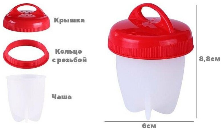 | Дополнительная информация | Наденьте кольцо на формочку и закрутить крышку. Смажьте форму маслом перед тем, как залить в неё яйцо. Залейте яйцо и по желанию добавьте ингредиенты. Закройте крышку и поместите форму в кипящую воду. Важно! Помещайте форму аккуратно, не допустив попадания воды внутрь. Для яйца всмятку потребуется 7-10 минут, яйца вкрутую - 12-15 минут. |