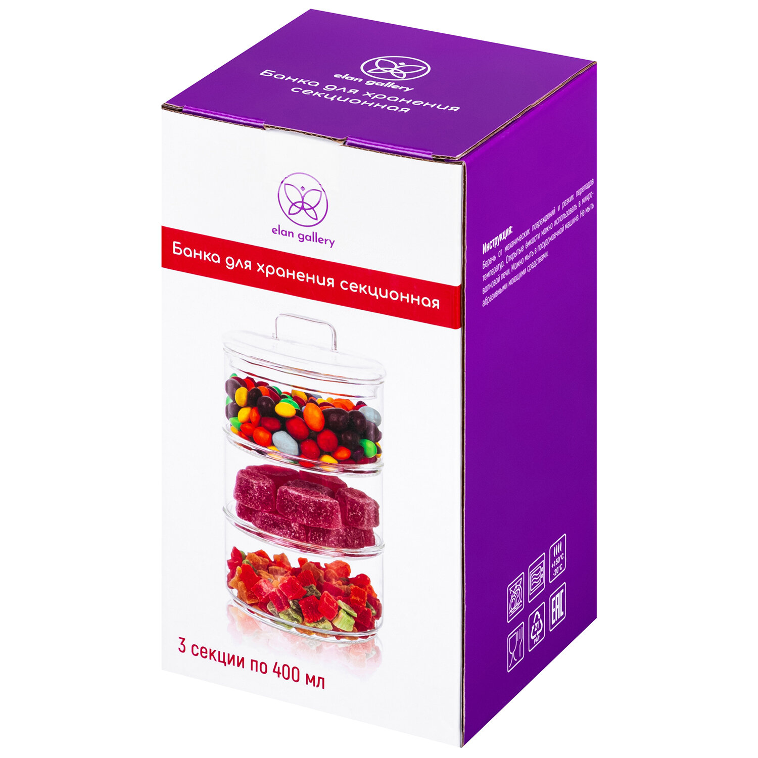 | Комплектация | Банка для хранения 3-х секционная "Crystal glass" 11,5х11,5х20 см, 11х11х6 см 400 мл |