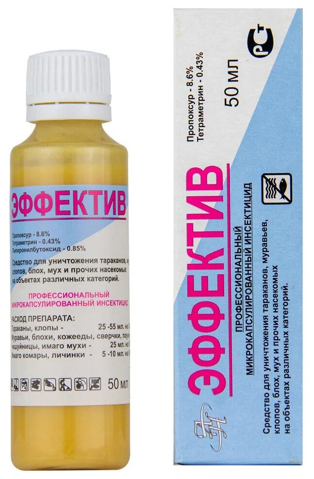 Эффектив (Эфектив) 50 мл. микрокапсулированное средство от насекомых (без запаха) - используется для уничтожения клопов, разных видов тараканов, муравьев, блох, личинок комаров, кожеедов, чешуйниц, а также сверчков и пауков.