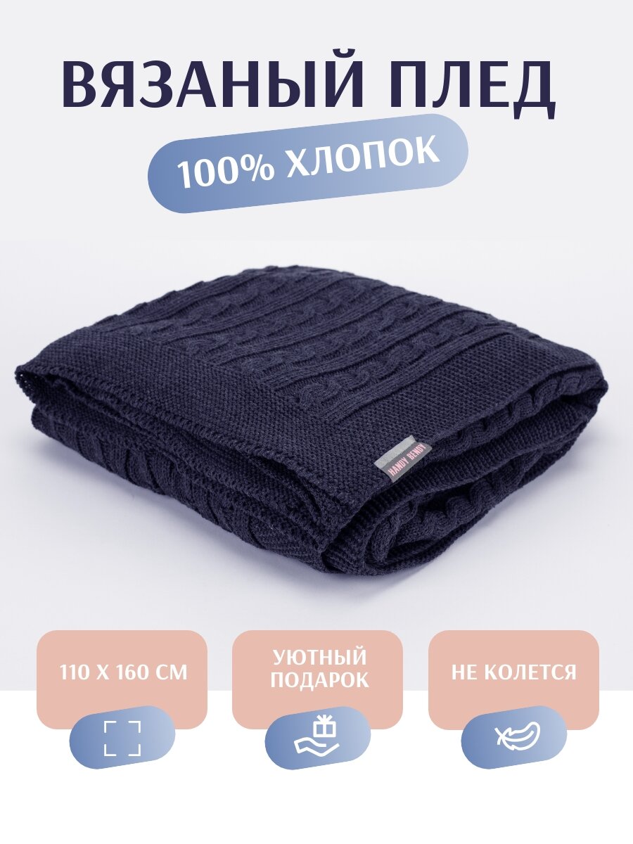Вязаный плед из 100% хлопка, 110х160 см, синий джинс