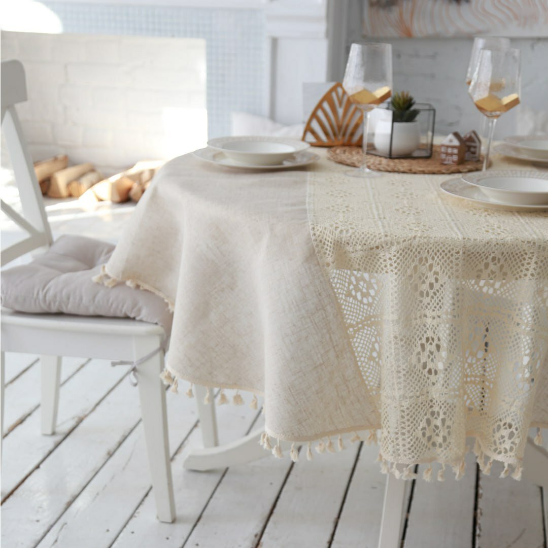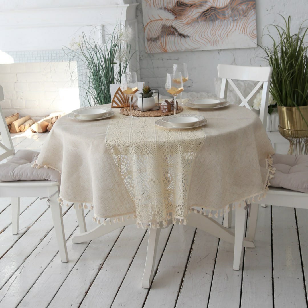 Бежевая скатерть круглая JollyCook тканевая на кухонный стол кружево и лен 150*150 интересное: