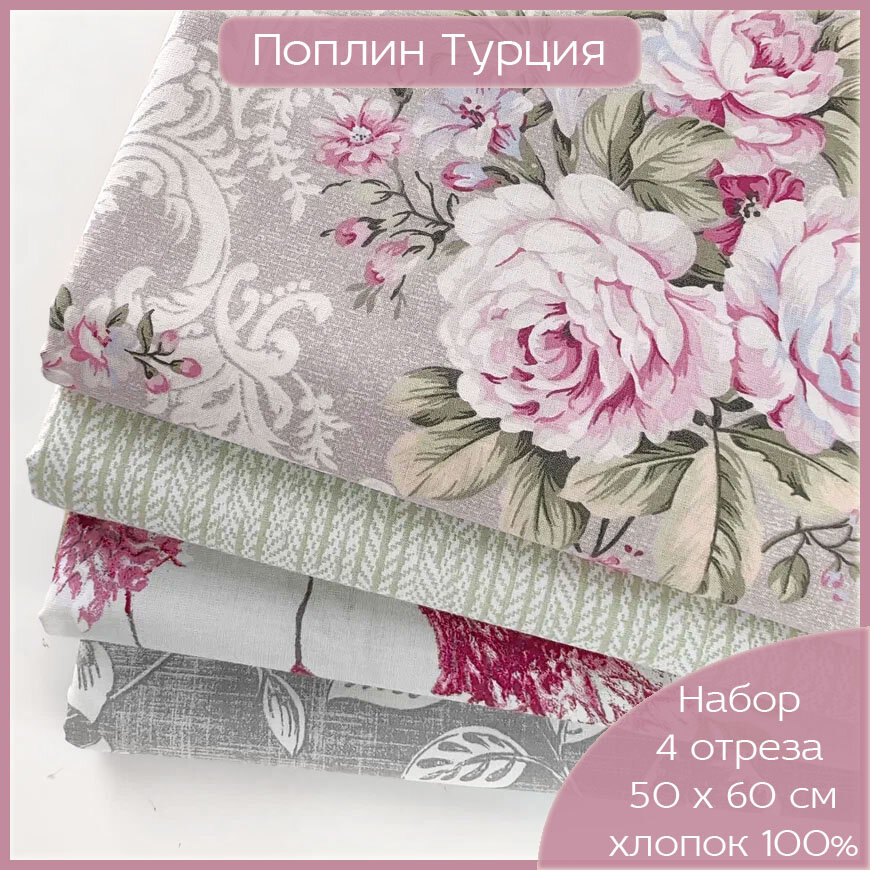 Ткань для шитья, рукоделия, 100% хлопок поплин Турция, набор тканей для пэчворка нежные розочки, 4 отреза 50 х 60 см