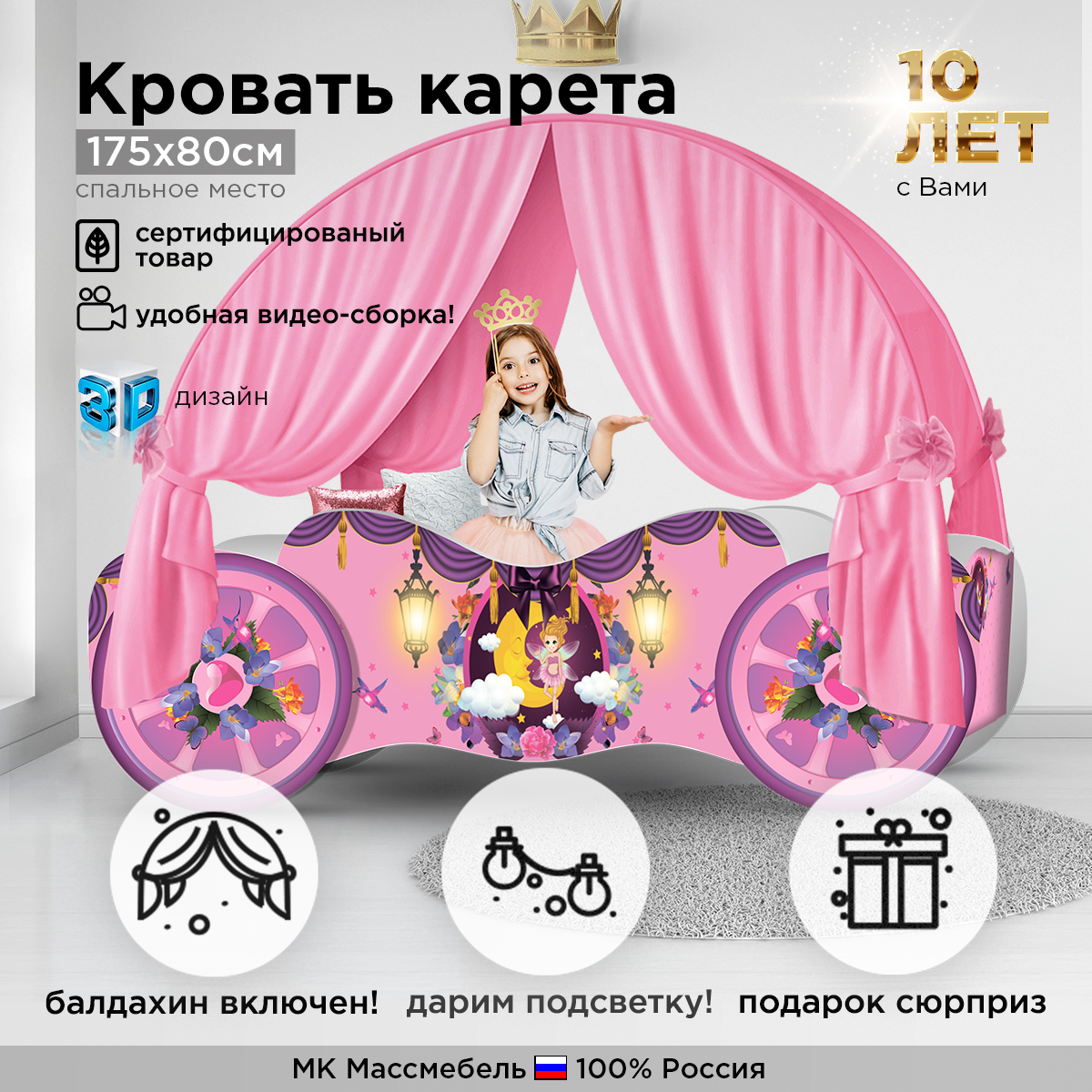 | Комплектация | Кровать карета, каркас для балдахина, дизайнерский балдахин |