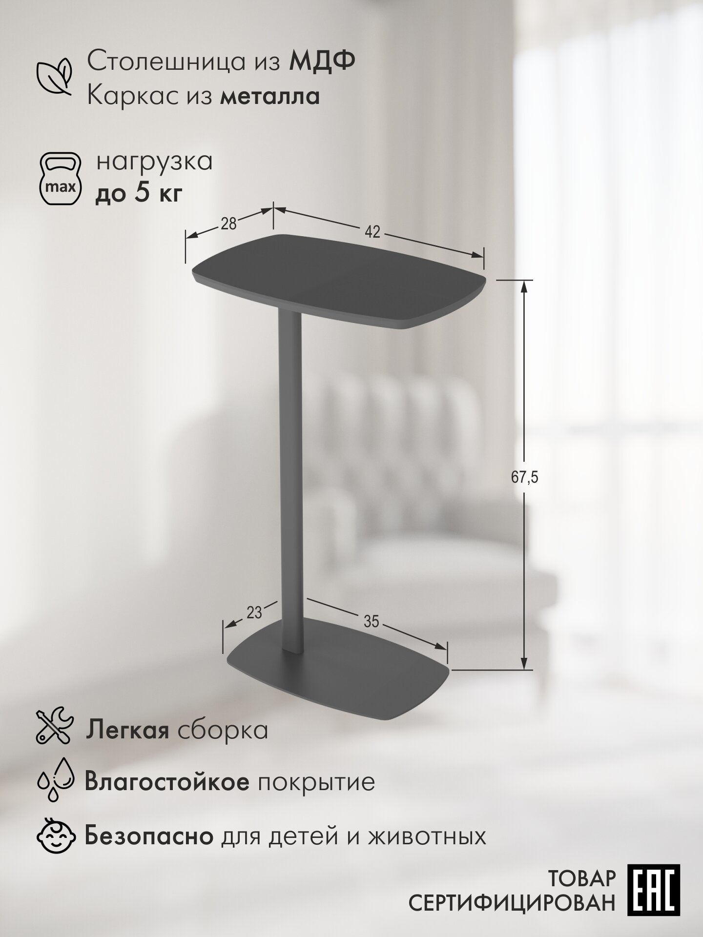 Придиванный стол Калифорния ДЕЙ колор Графит Размеры: Высота 675мм Глубина 280мм Ширина 420мм