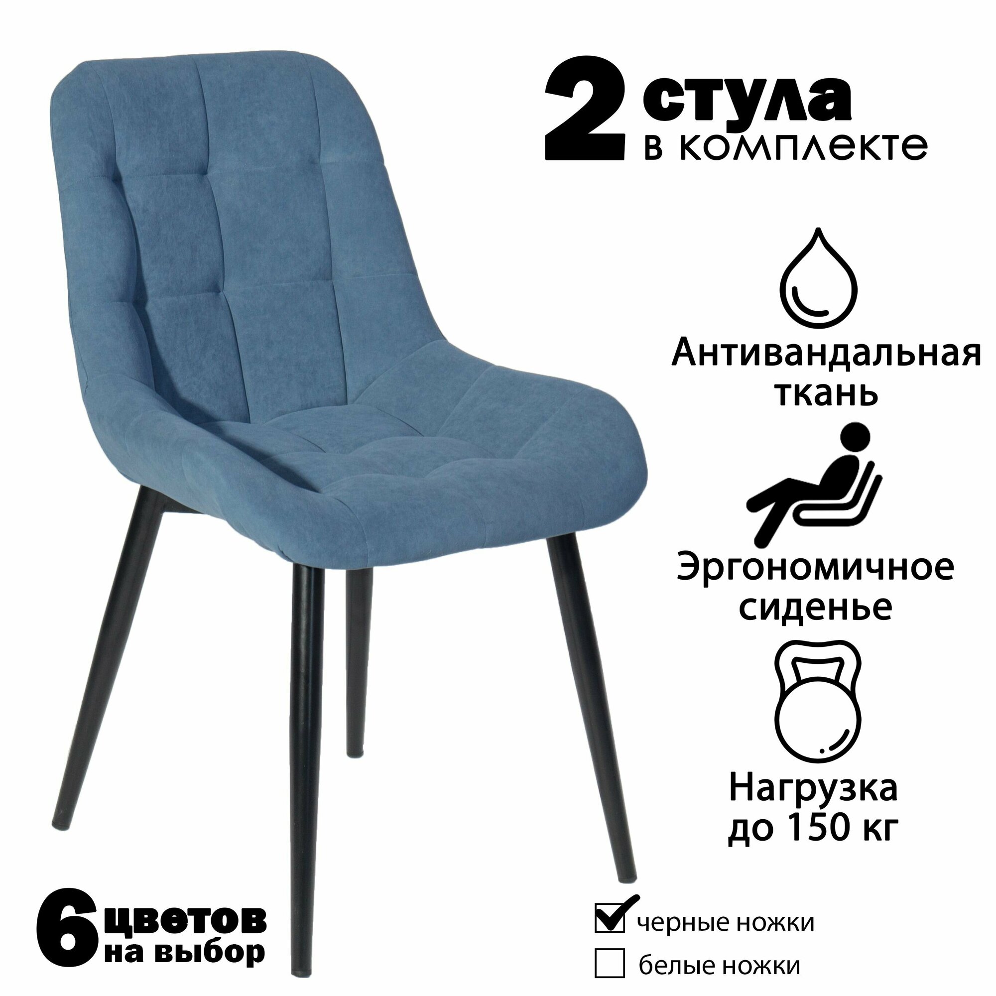 Купить Стул мягкий кухонный, комплект из 2 стульев для кухни румба, синий велюр, черные ножки