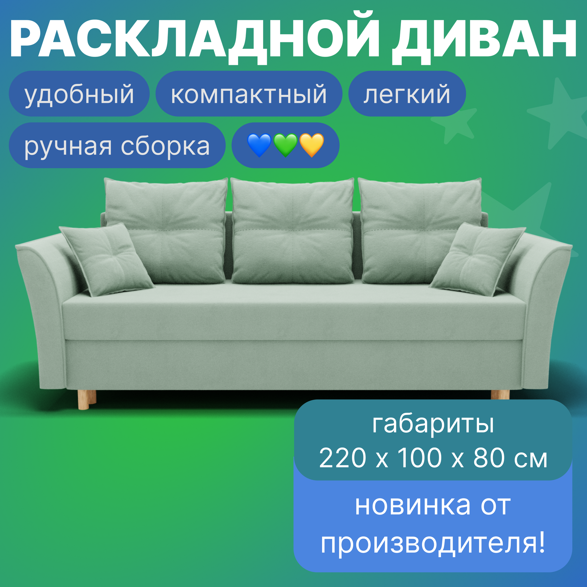 Диван, диван-кровать, диван раскладной "Пандора" ППУ, Велютта люкс 42, размеры 230х80х100, светло-зеленый