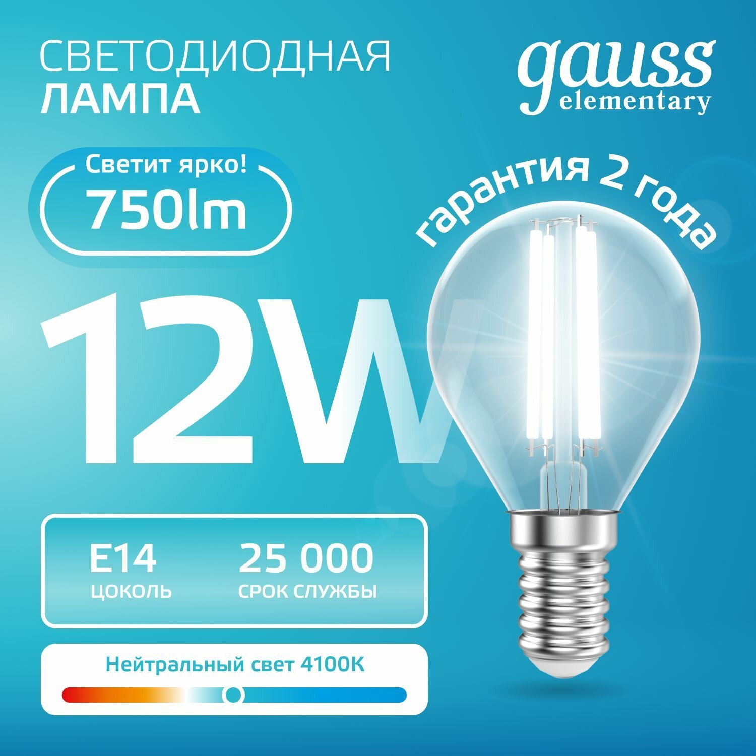 Купить Лампочка светодиодная E14 Шар 12W нейт белый свет 4100К упаковка 10 шт. Gauss Elementary Filament