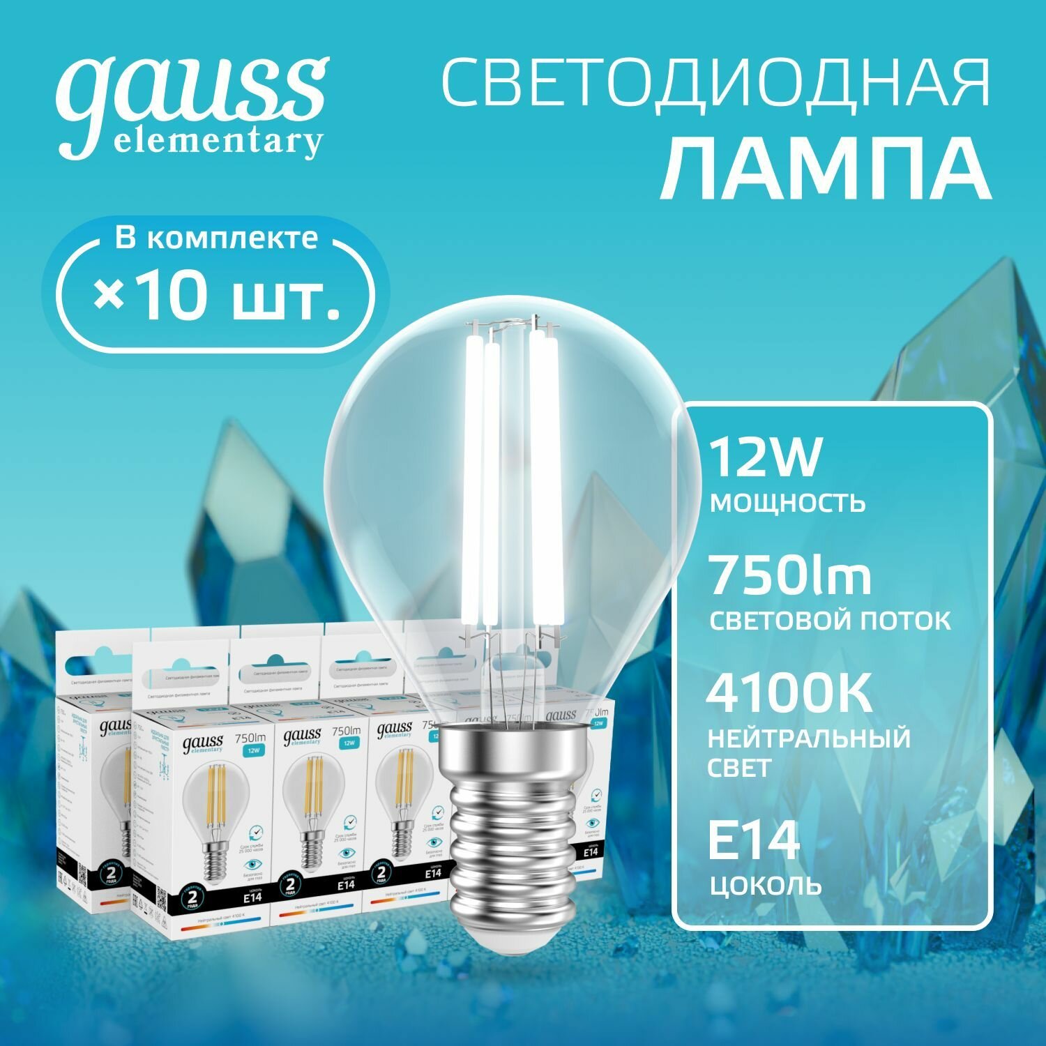 Лампочка светодиодная E14 Шар 10W нейт белый свет 4100К упаковка 10 шт. Gauss Elementary Filament