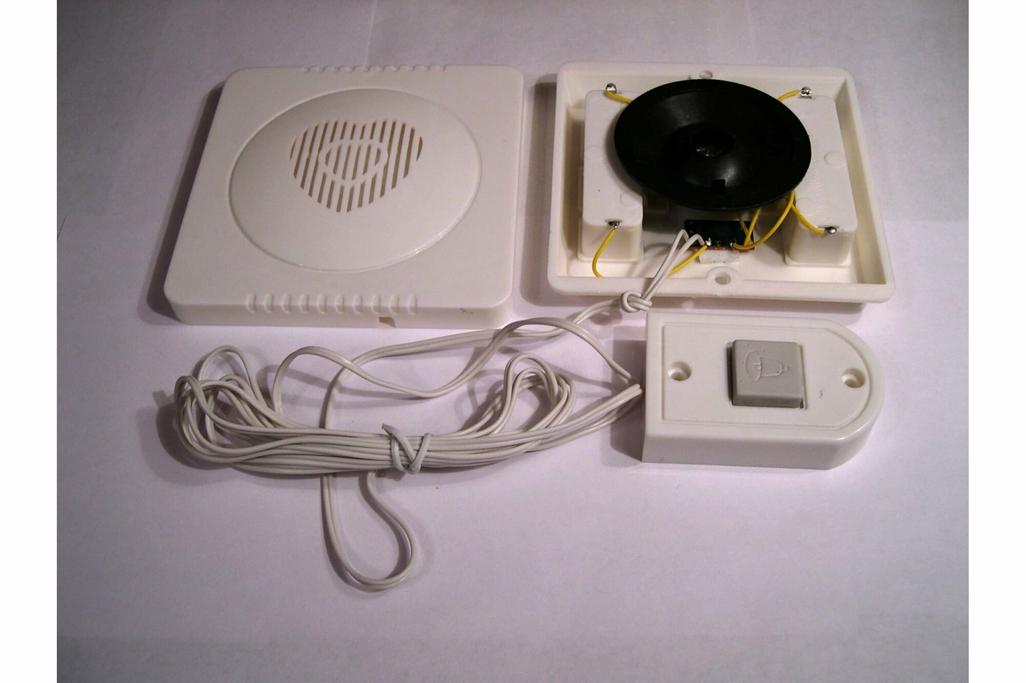 Купить Звонок проводной Сюрприз 12 мел. с питанием от батареек с кнопкой и проводом 2ААх1.5В 80-90дБА бел. Тритон СР-02Б