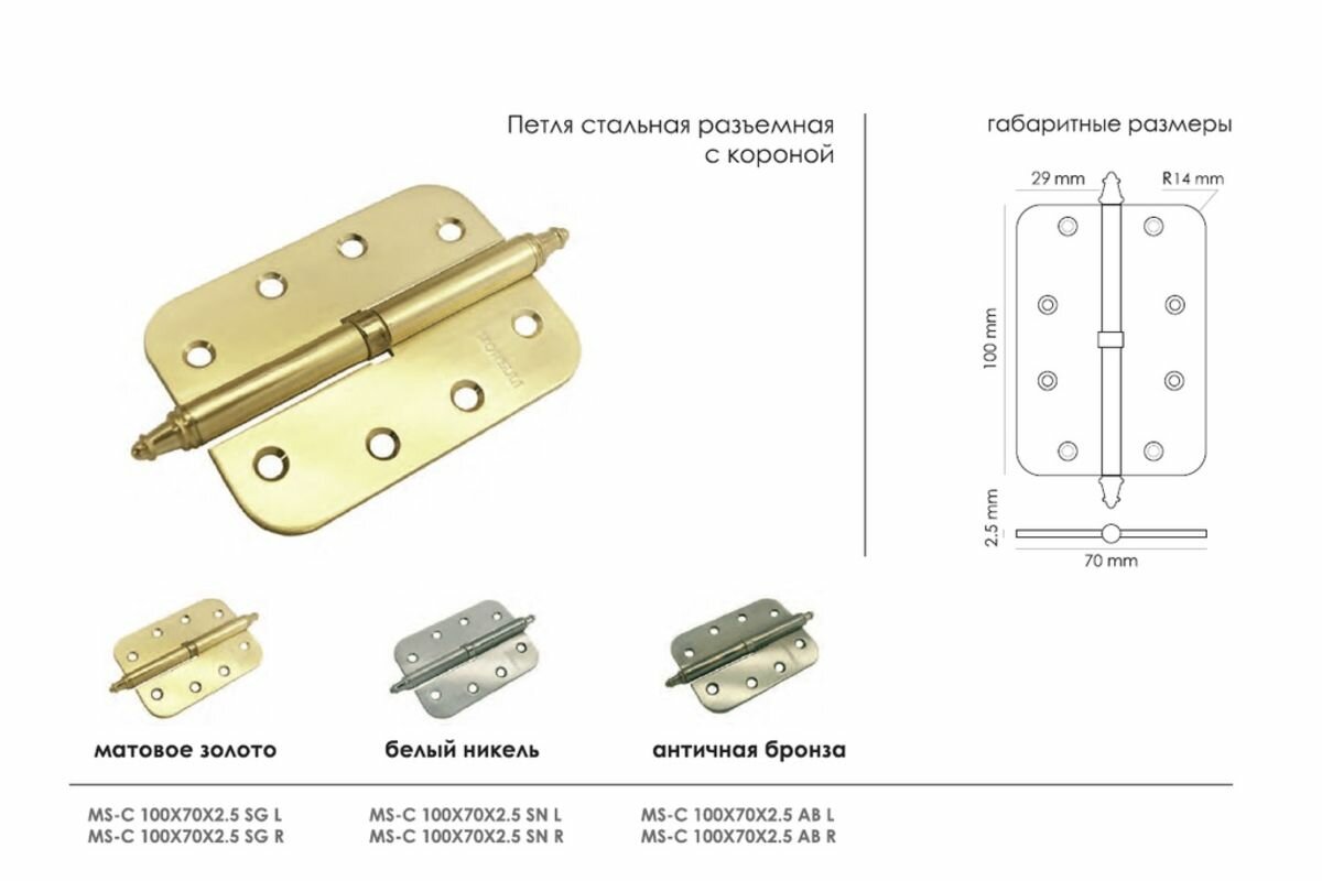 Купить Петля Morelli стальная разъемная скругленная с короной MS-C 100*70*2.5 SN R белый никель