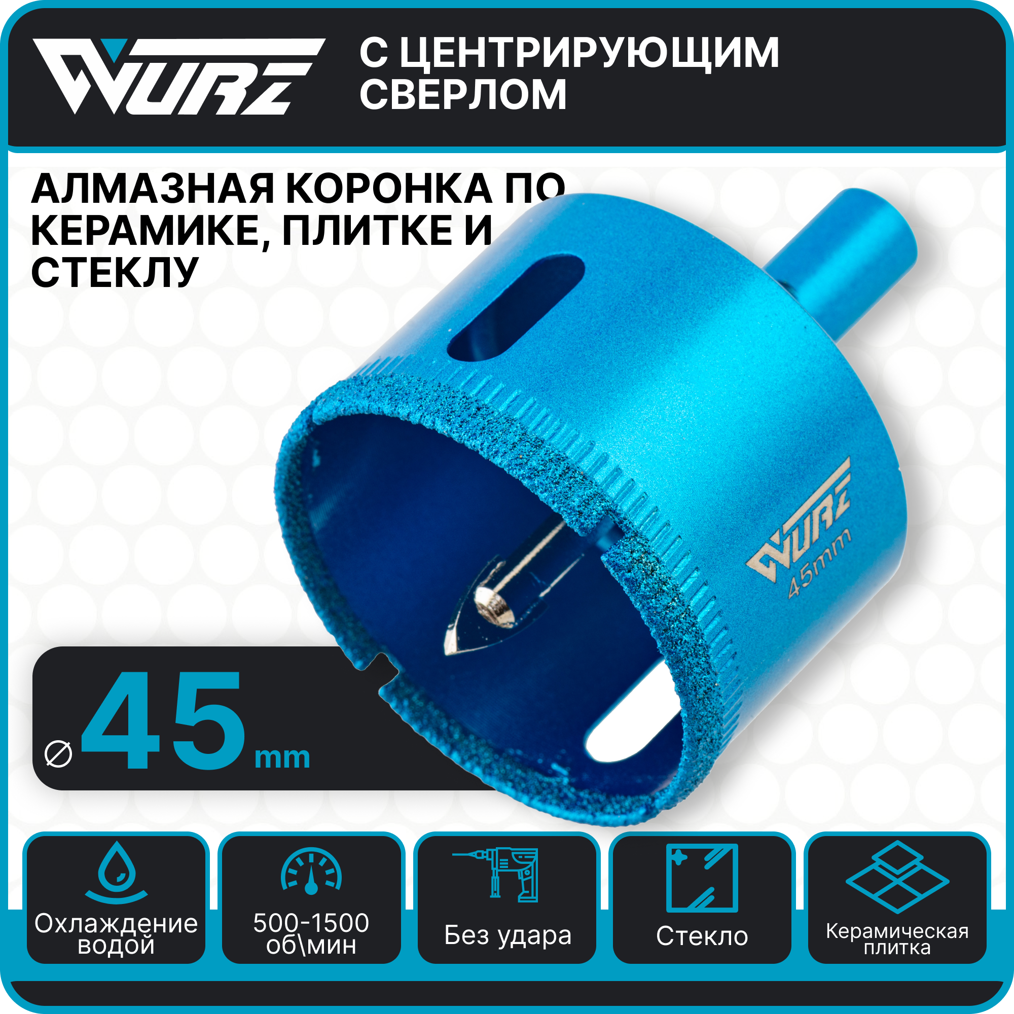 Купить Коронка алмазная 45мм с центрирующим сверлом по керамике и стеклу Wurz 92045
