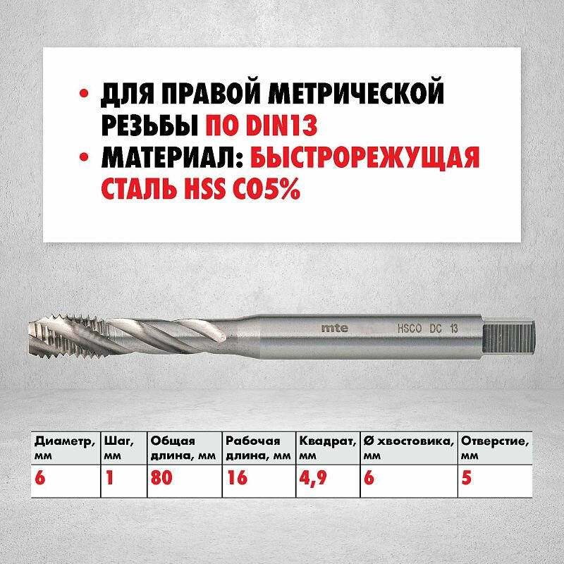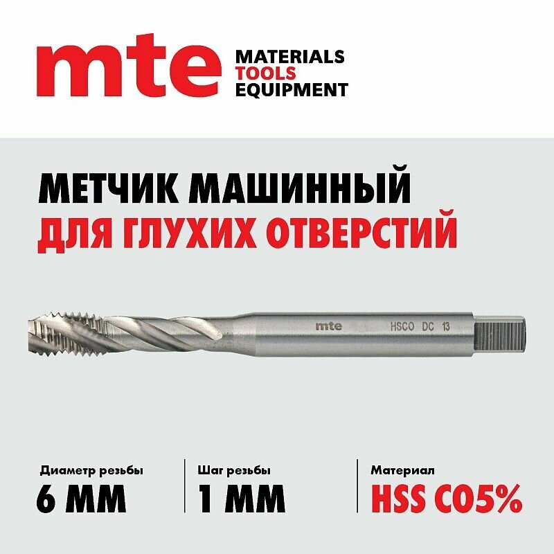 Купить Метчик машинный HSS Co5% DIN 371 С для глухих отверстий M6X1,0, mte