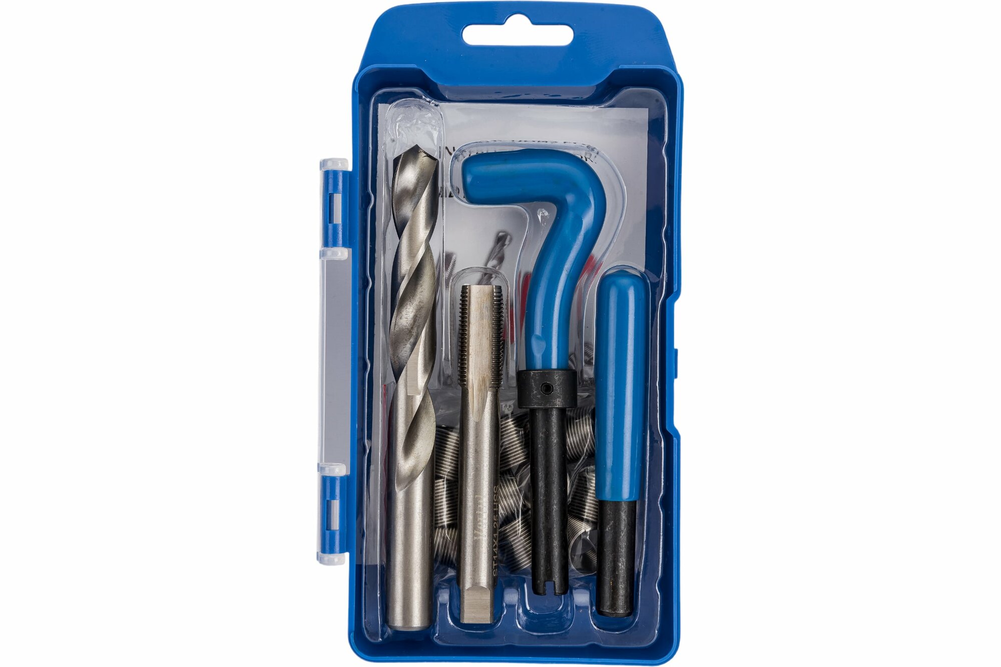 | Подробная комплектация | Комплект включает в себя 10 предметов Резьбовые вставки: М14×1.5Х21.0 мм (5 шт.). Сверло 1 шт. Метчик 1шт. Выколотка 1шт. Оправка для вставок 1 шт. Ключ шестигранный L-образный, 2 мм (1 шт.). |