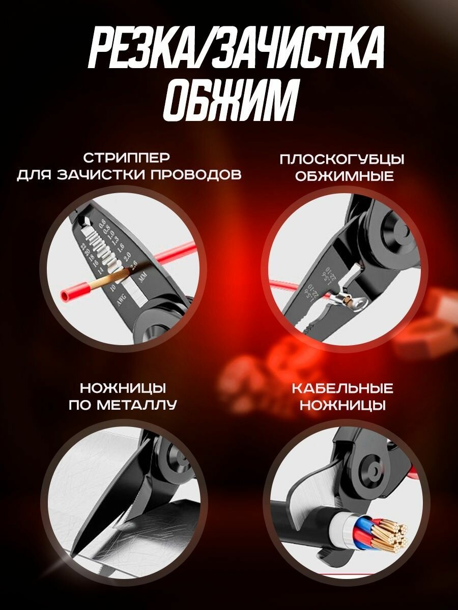 | Дополнительная информация | пассатижи; плоскогубцы обжимные; ножницы по металлу; Стриппер зачистка проводов; Ножницы для кабеля |